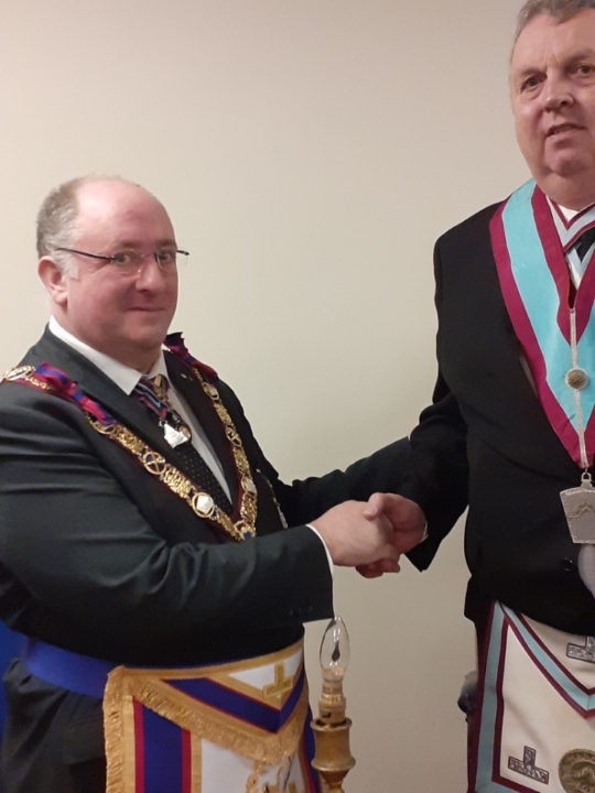 With the ceremony completed it was again time for WBro Sarti to jump to his feet and bring the congratulations and thanks of the PGM to WBro Bresnen, for taking the chair once again. Being the Provincial Charity Steward, John was delighted to receive the charity cheque from the Worshipful Master. |