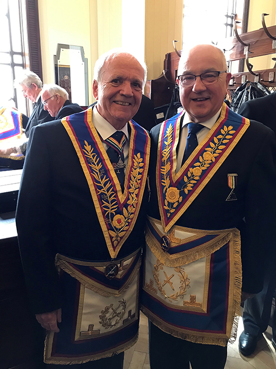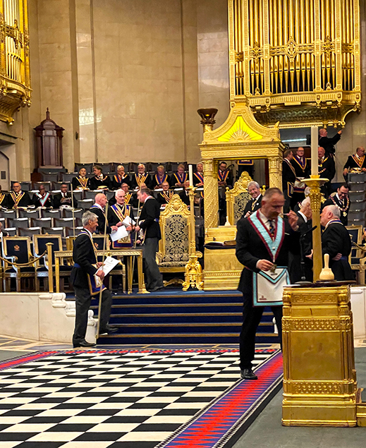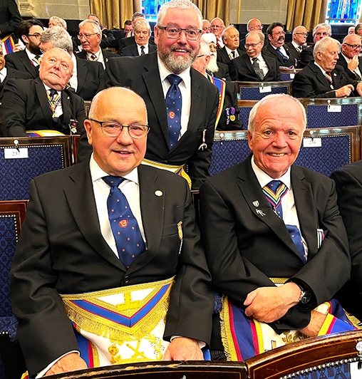 Over 1300 Mark Masons attended the meeting and what a brilliant site it made in the Temple, before the meeting opened you could feel the buzz from everyone present, especially all the members who were receiving First Time Honours, Promotions and the Acting officers for the ensuing year, including a new AGM R.W. Bro. Francis C. Spencer. | |