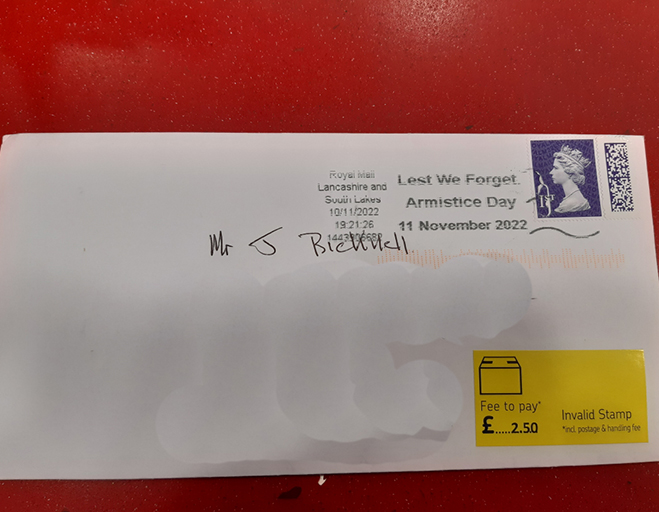 I went to the local sorting office at Chorley today and was shown the letter (shown in the attached photo) which states “Invalid Stamp” and the amount of the fee to pay.
