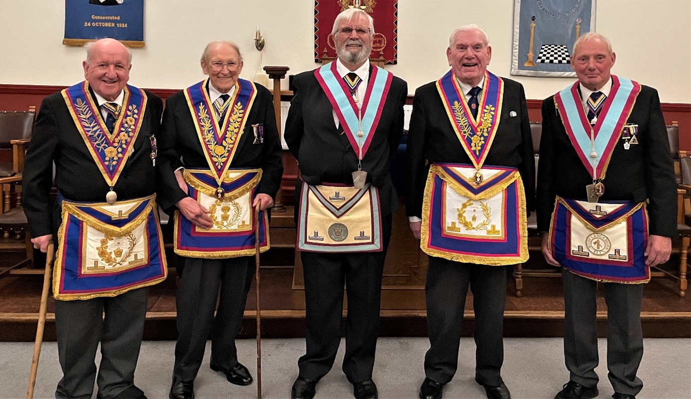 Wilbraham Lodge No 523 was honoured by the presence of V W Bro Derek Horrocks PGJO, representing the RW PGM, at their proclamation ceremony on 14th April. W Bro Ian Rowan continued in office after having been installed at a special meeting in October 2021 following the resumption of masonic activity caused by the Covid-19 lockdown. |