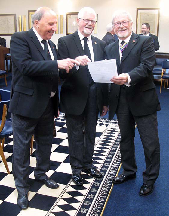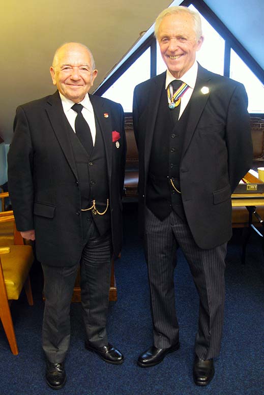 Many surprises were to follow, the first one came when the PGM asked for W.Bro. Norman Meadows P.Prov.G.Insp.Wks. (Charity Steward) to be presented, due to his outstanding service to the Lodge and others he had much pleasure in promoting him to PPrGJW, apparently he is a brother who is never stuck for words but on this occasion, he was speechless. Keith was delighted to also present Lodge Secretary W.Bro. Derek Todd P Prov GSW with the very special Royal Ark Mariner Ambassadors Jewel for his excellent work in promoting that degree. |
