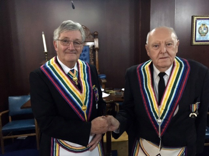 W.Bro. Geoffrey M. Bury with the new Worshipful Commander Bro. Thomas Lawrence Egan |