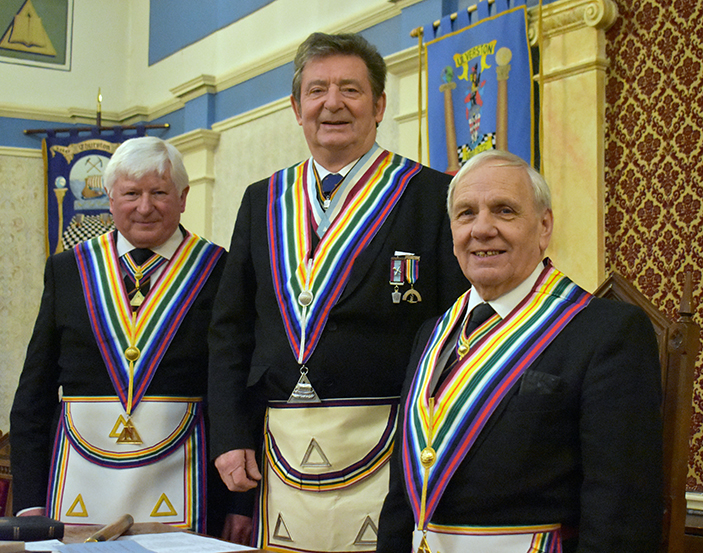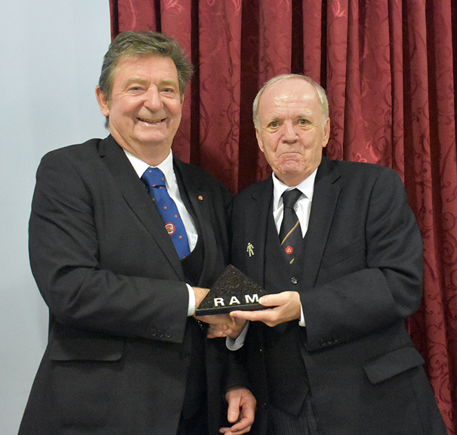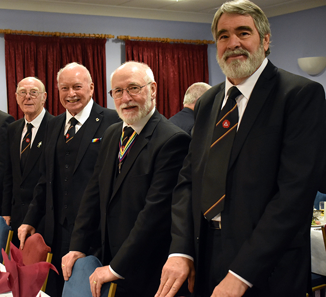 The address to the Worshipful Commander was undertaken in a delightful manner by director of ceremonies Les Preston. Les, and his assistant Kieron Mullan can take satisfaction from a job well done. They were supported during the evening by Ken Boon who had been called into action to act as the provincial deputy director of ceremonies accompanying the APGM. Although there was a change in circumstances Ken nonetheless led the salutations and added to the enjoyment of the ceremony and installation banquet. I was pleased to be asked to present the keystone jewel. | |