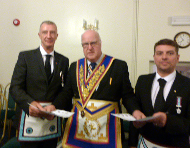 WBro Mike Cunliffe opened the lodge at 5.00pm and then approved the minutes. Then the dispensation had to be read to hold the installation meeting. Then it was ballot time for two new members and a joining member. The ballot for all three proved favourable and the joining member WBro Len Hudson was admitted and he even got a job before the end of meeting. After the salutations had been given, it was time for the first round of musical chairs with WBro Cunliffe finding himself in the Senior Overseers chair. Others also picked chairs and this left WBro Derek Gaskell, PPrGJW, catching the last chair available which meant that he did the double advancement. Someone who had kept hold of his own chair was Bro Tommy Lunt the Inner Guard, who announced the two candidates, Bros Alan McGregor and Keith Lindsay and the first part of the ceremony, was underway.