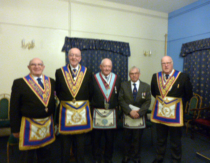 WBro Foster’s charm was put to the test for a second time. On completion of the advancement ceremony Bros McGregor and Lindsey were welcomed into the Mark degree and congratulated by both WBro Alan Fairhurst and WBro Steve Walls. WBro Walls also presented the two candidates with a welcome letter from the PGM and given their invite to Provincial Grand Lodge meeting on 5th May at Blackpool. It was now time for the second round of musical chairs which saw WBro Mike Cunliffe retake the Master Chair but now as Installing Master and WBro Len Hudson got the Inner Guard’s chair. When all the moves had been completed; WBro Fred Hulse, PPrGSwdB, presented the Master Elect, Bro Doug Lace to WBro Mike Cunliffe for the benefit of Installation.