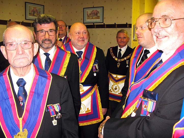 Next W.Bro. Jimmy Rogers PGJD Secretary of the Lodge read out a more detailed History of the Lodge and also pointed to the small booklets which had been prepared for the occasion, all the visitors present had received a copy of the booklet along with the special coin which all the members had received, a really nice gesture and a keepsake. This amazing Lodge received the Benevolent Gold Award which was presented to the W.M. and W.Bro. Jimmy Rogers PGJD received the amazing Mark Benevolent Fund Diamond Award. It was now time for the R.W. Bro. Francis Charles Spencer Dep Grand Master to retire from the meeting, he thanked all for their attendance, the Lodge rose as one as he was escorted by the Prov D.C. W.Bro. Arthur Robinson G.J.D. The PGM called on the Provincial Grand Secretary Mike one more time and asked if he would read out the Provincial Centenary Warrant, before presenting it to the WM. and that was it, what a great meeting, I’m pretty sure that all who were present will remember it with a warm glow for many years to come. |