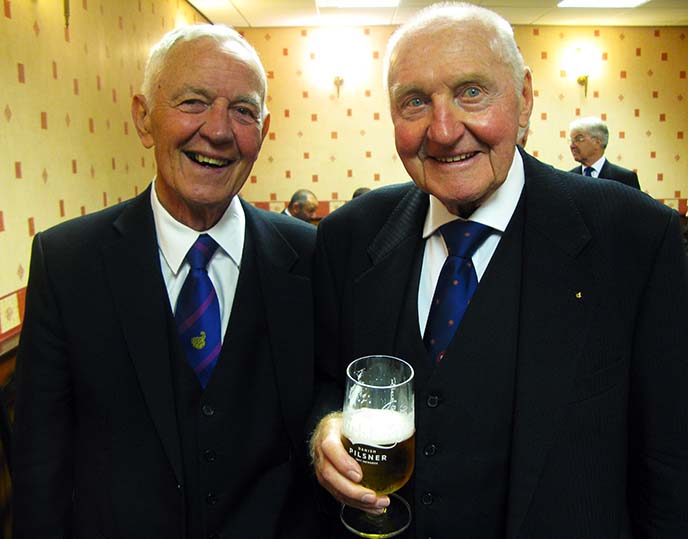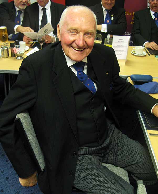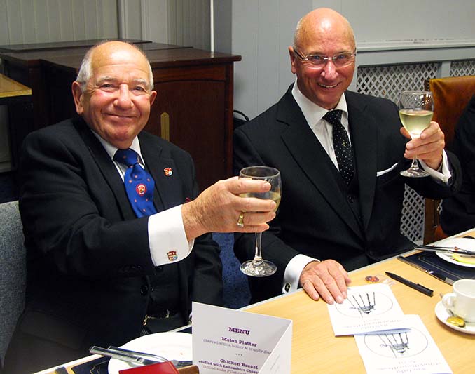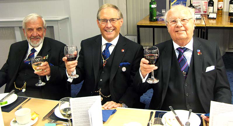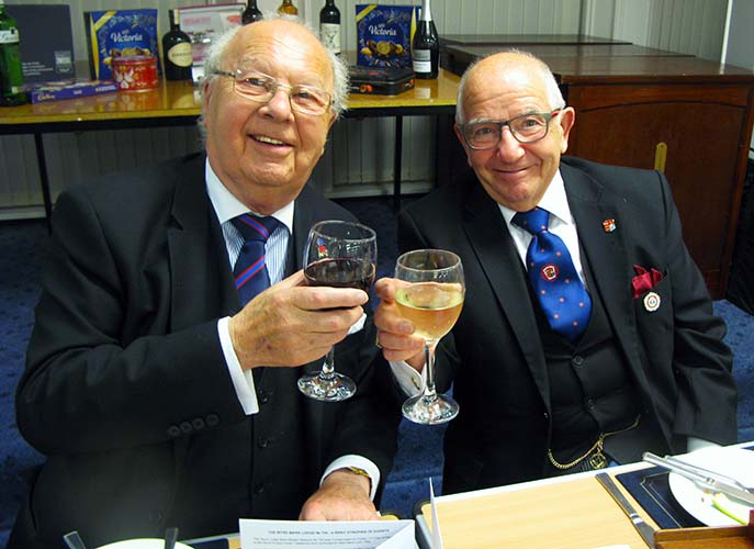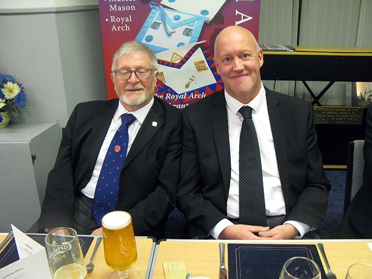 Everyone made their way to the dining room for the Festive Board, which I must say was immaculate complete with place cards, the history booklets and one of the special Centenary coins. Once glasses were charged and we took up our allotted seats an excellent meal was served up by the friendly and efficient Hall Staff. The usual Toasts and some excellent responses were given including one from the R.W. Bro. Francis Charles Spencer Deputy Grand Master who was found during the evening to be very approachable just like our own R.W. Bro. Keith Alan Beardmore PGM. | |