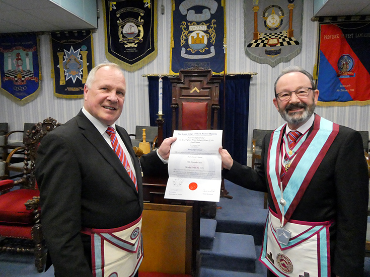 WBro Gordon Hinchliffe presented the certificate and explained the various significances of it to Bro Mark Smith. | |