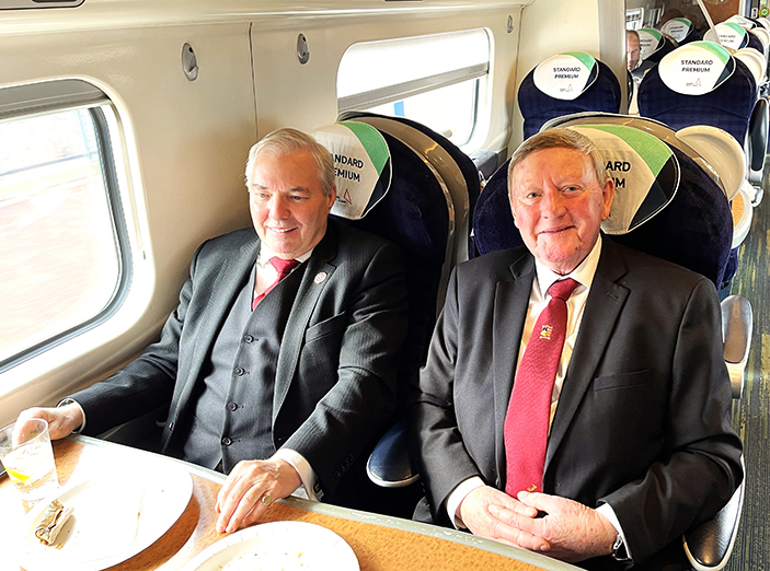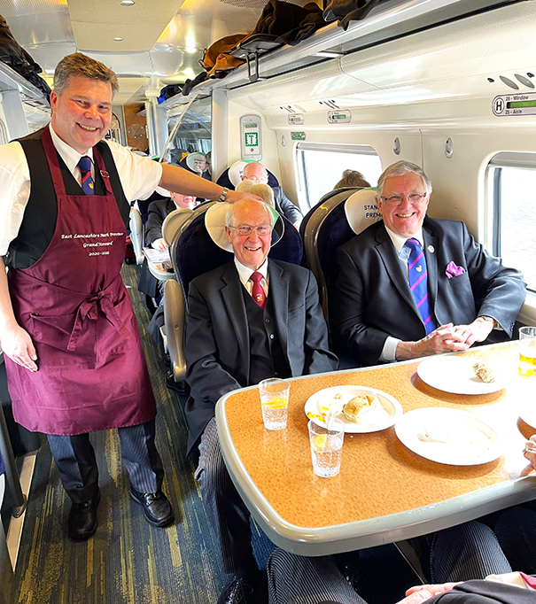 I spoke to him, he pointed at my tie and said on your own come over and join us, there’s a group here from East Lancs. There was eleven brethren sat together chatting and they made me feel very welcome, once the train pulled out one of them came and found me, he said come along and sit with us, we have a spare seat. Well how nice was that, half an hour into the journey W.Bro. Steve Lord who had been a Provincial Mark Steward in 20/22, came round to everybody including me asking what would you like to drink, he wasn’t kidding either, he meant a proper drink, G & T, Brandy and of course in my case you’ve guessed, I’d like a whisky please. Following on from the drinks he then came round with food, meat pies, Beef sandwiches and even had Horseradish and Mustard, oh I nearly forgot the sweet, Eccles cake with a slice of Lancashire cheese. |