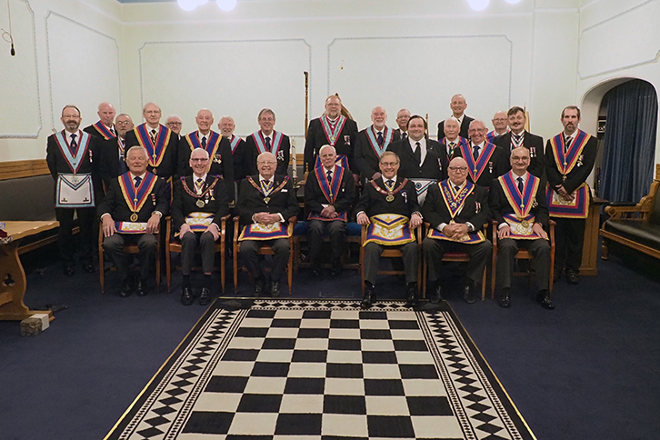 The lodge was closed shortly afterwards and after the customary photo call the brethren retired to the banqueting suite for a fine repast. Following the meal, the usual toasts were observed. In response to the toast to the grand officers, proposed by senior warden, Glenn O’ Brien, it fell to Giles Berkely to speak and amid much frivolity, he was able to pay a serious tribute to Geoffrey Lee and John Bicknell, who will be standing down from high office at the next meeting of Provincial Grand Lodge. Giles acknowledged the immense amount of work they had both done during their time in some of the most challenging positions of leadership.