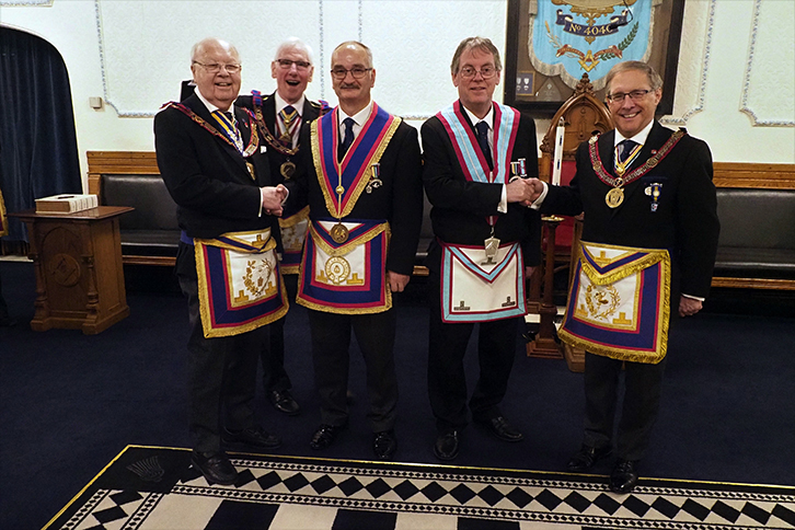 Andrew’s presentation was followed by the presentation of a certificate from the Provincial Grand Master, Keith Beardmore, conducted by Geoffrey Lee. He congratulated the lodge on achieving the milestone of 60 years in existence and said that the lodge had made further advancement by the impending promotion of Shaun Haynes to Grand Rank and of Chris Sage to Acting Provincial Grand Steward, the later to be invested at the next Provincial Grand Lodge meeting later in the month.