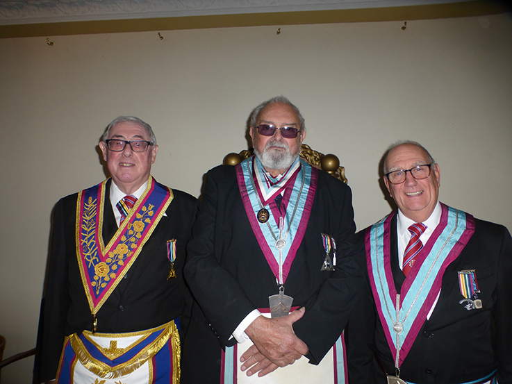 Four fine addresses to match the first-class Installation ceremony. Now it was time for the APGM to bring the congratulations of RWBro Keith Beardmore, PGM to both WBro Ivan Hicks on taking the Chair for the first time and also to WBro Neil Cooper on his fine ritual. A charity cheque was presented to VWBro Geoff Bury on behalf of the Lodge by VWBro Fred Hargreaves, which was gratefully received. | |
