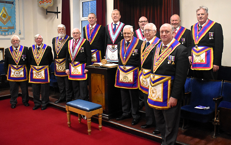 Members of the lodge with special representative David Robinson to the right of the WM |