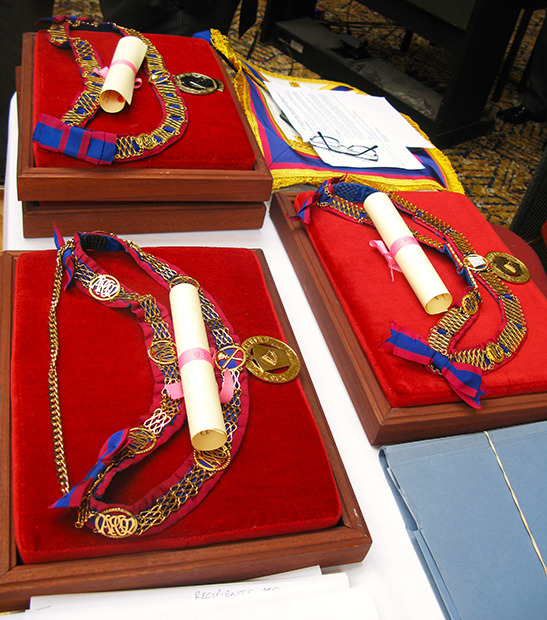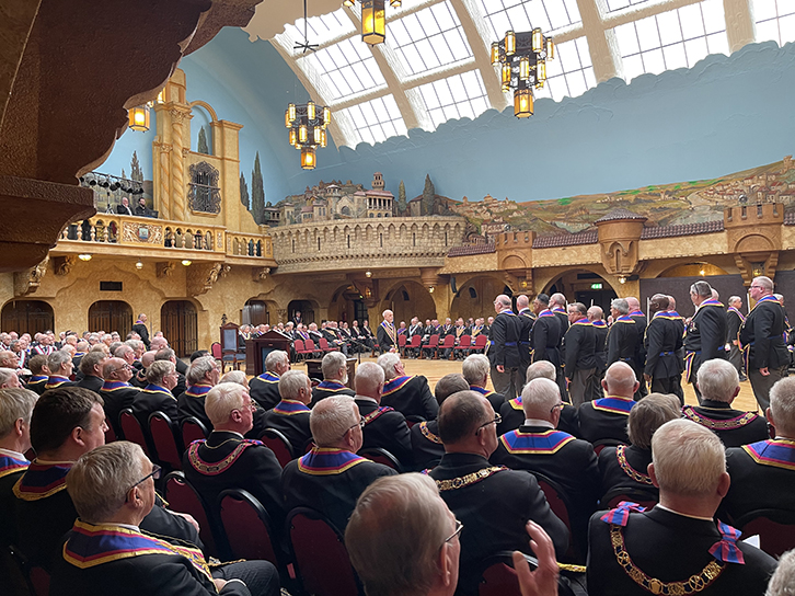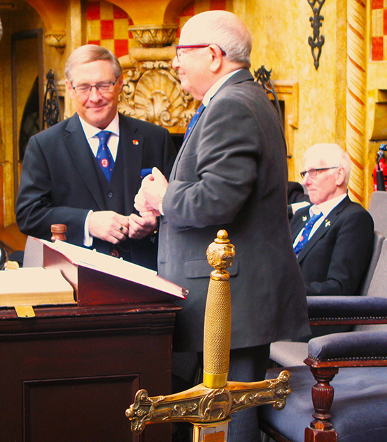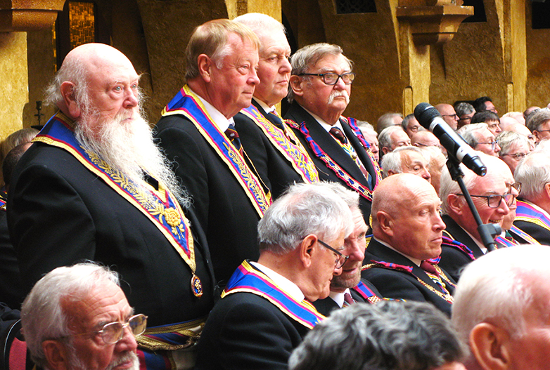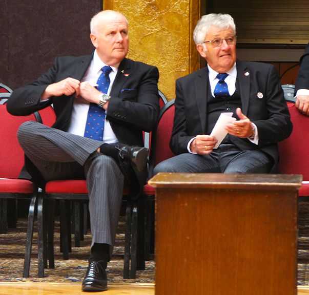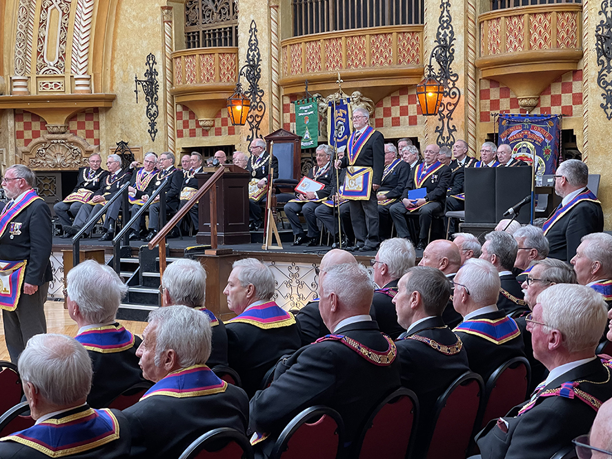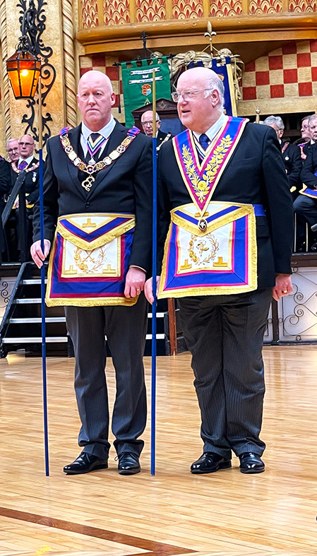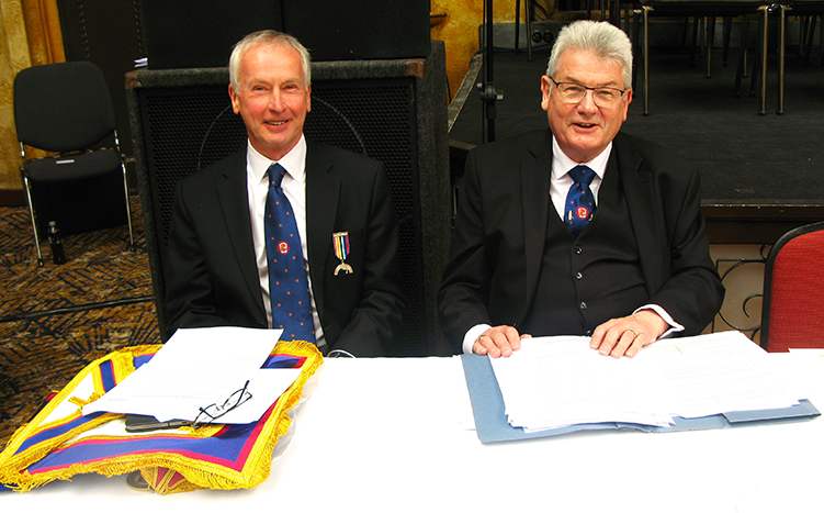 The meeting commenced on time at 2pm, Worshipful Master’s or their Representatives from all parts of the Province were welcomed followed by a deputation of Worshipful Commanders. Our PGM was Saluted before time was taken by all present to remember those, we have lost over the past twelve months. The Deputy PGM was appointed and Invested and then two new Asst PGM’s V.W. Geoffrey Bury and W.Bro. David Winder were appointed and Invested. | |