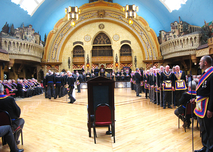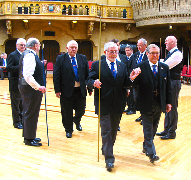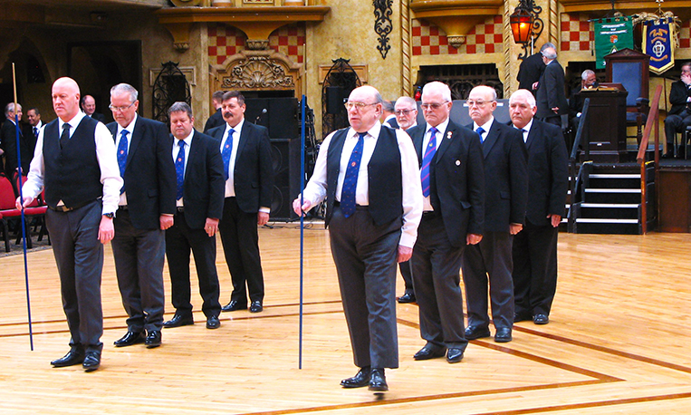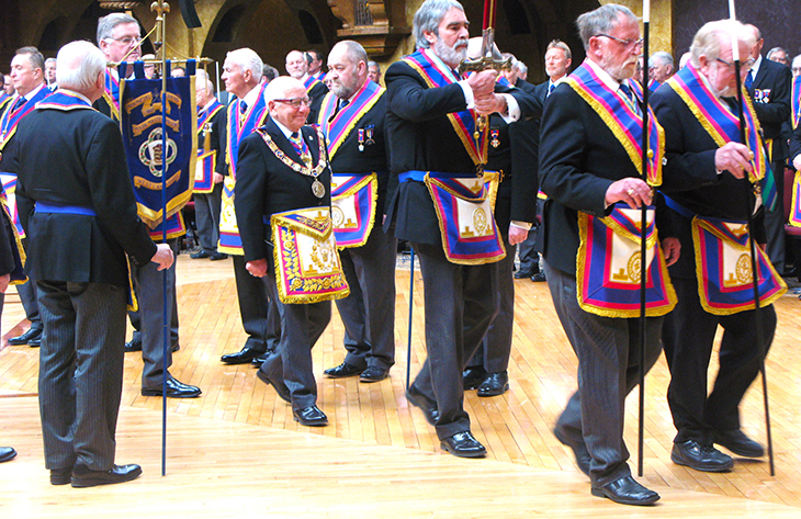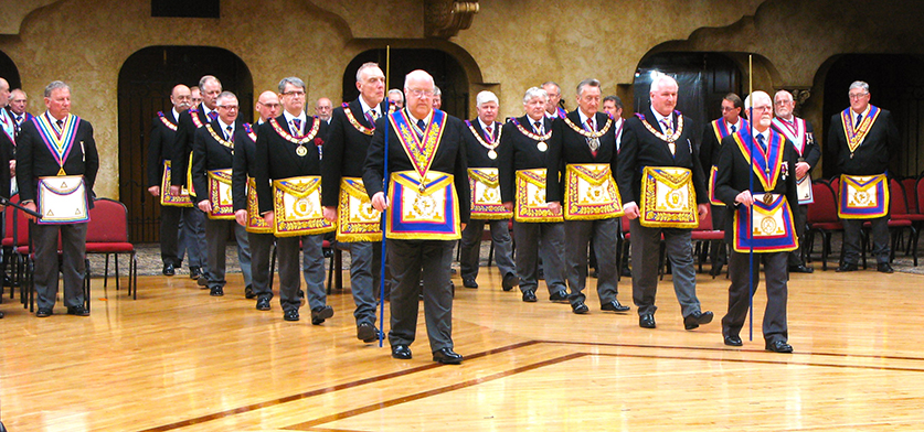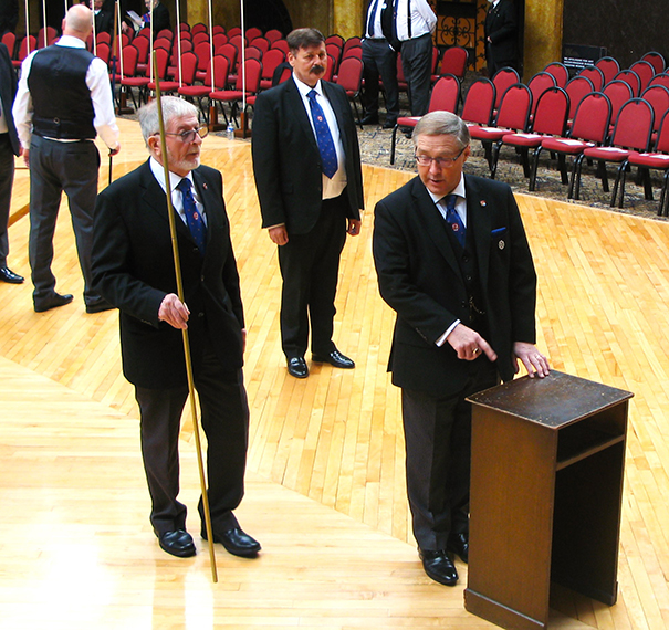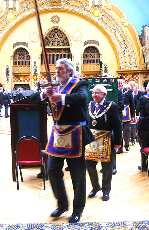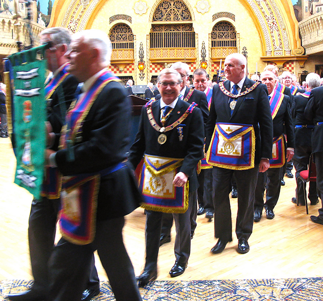 Set off early as usual, no hold ups to speak of even the on ramp wasn’t too bad, having said that the traffic on the opposite side of the M61 where it joins the M60 was tailed back for miles, and I mean miles. Arrived in good time at 9.30, signed in and made my way to the hall to find the Prov D.C. W.Bro. Arthur Robinson and his team already working hard on the Ceremony proceedings. There was a terrific atmosphere, lots of smiles and genuine handshakes of pleased to see you, then it was my turn to join in as one of the escorts for the newly appointed Deputy Provincial Grand Master W.Bro. Giles Berkley. | |