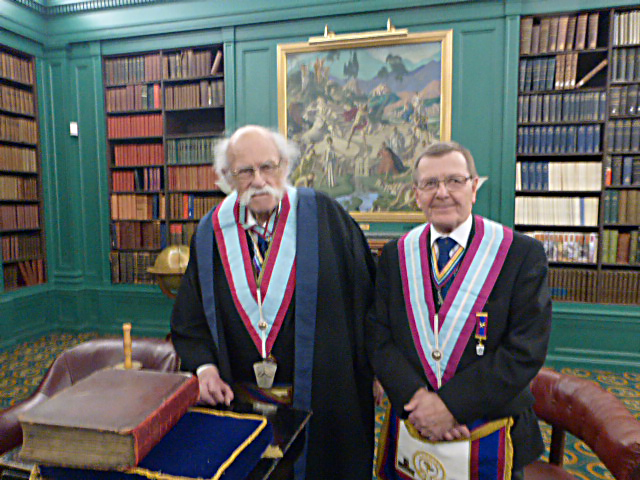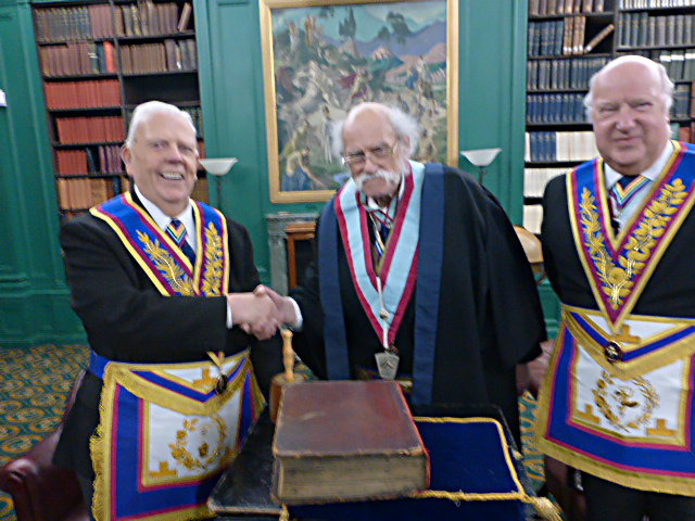 With the salutations completed, the next task for the acting DC, WBro Derek Gaskell was to present the Master Elect, WBro John. D. Ryan to the Worshipful Master WBro Dave Roberts for the benefit of installation. WBro Roberts carried out a fine ceremony, which was enjoyed by all those in attendance. WBro John Ryan always does the presentation of the Keystone Jewel to the New Master and at one point; John had considered presenting the jewel to himself. However on this occasion WBro Derek Gaskell did the presentation of the jewel. |