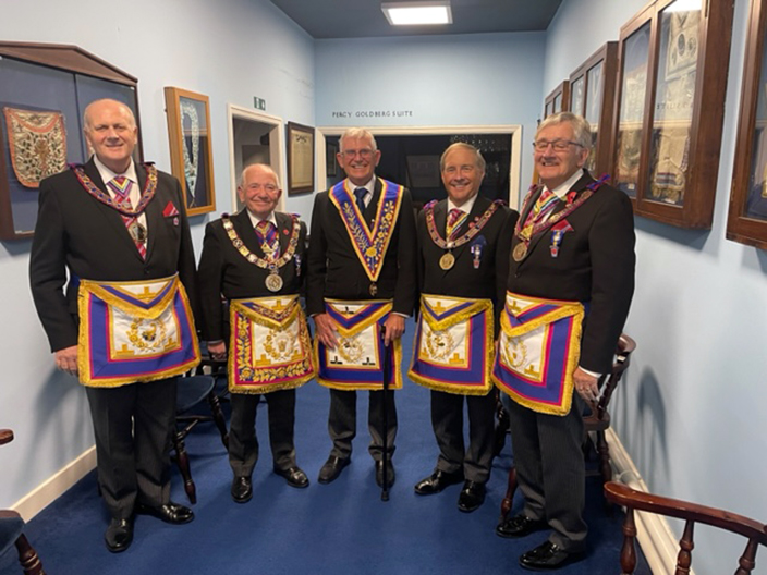 The Provincial Grand Master was accompanied by the Deputy PGM W. Bro. Giles Berkeley and both Assistant PGMs V.W. Bro Geoffrey Bury and W. Bro. David Winder at Preston Lodge of MMM No 143. for the 50 Year celebration of W. Bro Peter Watson P.A.G.St.B. |