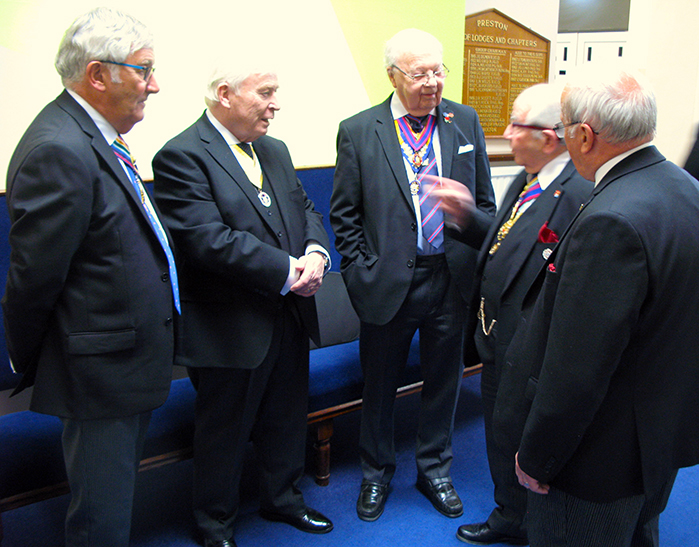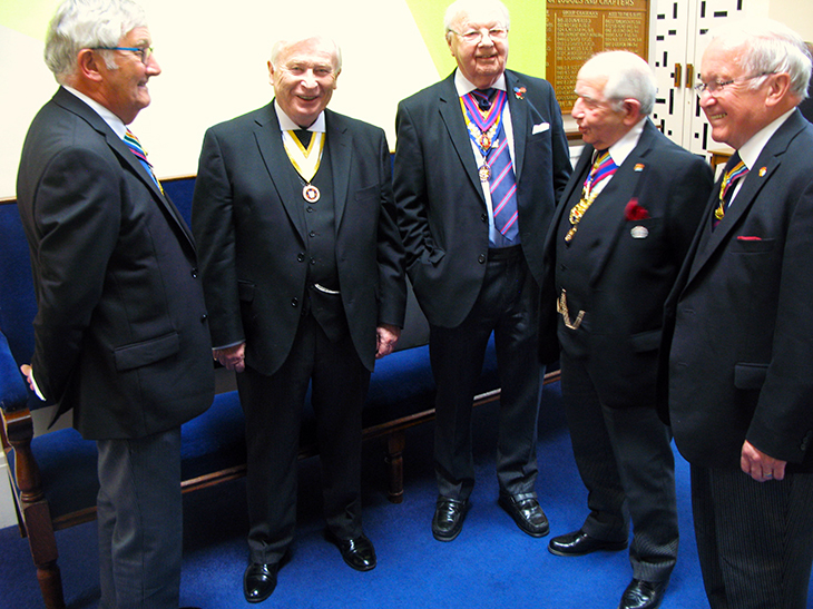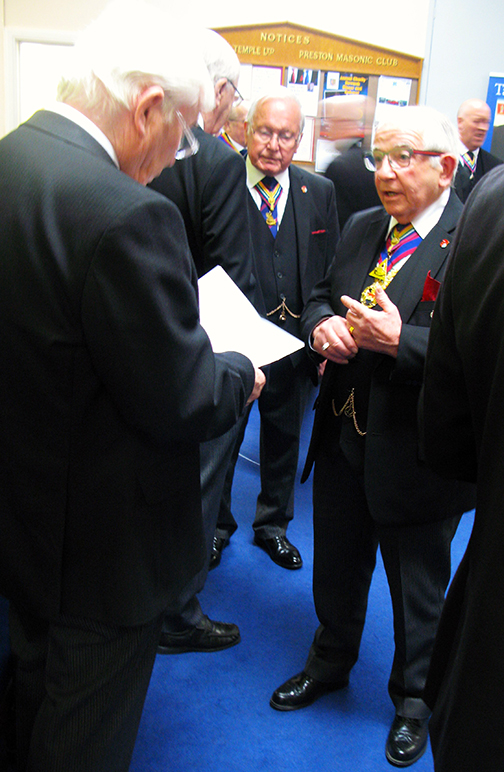 Now the practise was finished I went on my way looking round for some more targets, oop’s no not targets that doesn’t sound too good, I meant to say persons of interest and bingo, I couldn’t believe my luck, who did I come across having some happy conversation none other than our own PGM R.W. Bro. Keith Alan Beardmore, the Pro G.M. M.W. Bro. John Herbert Prizeman, Dep PGM W.Bro. Giles F Berkley PGJD, Asst PGM Geoffrey M Bury PGJO, Asst PGM W.Bro. David J Winder GStwd the P.G.Secretary W.Bro. Michael J Pinkard GStwd, and several other distinguished Mark Masons. | |