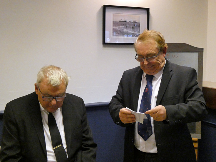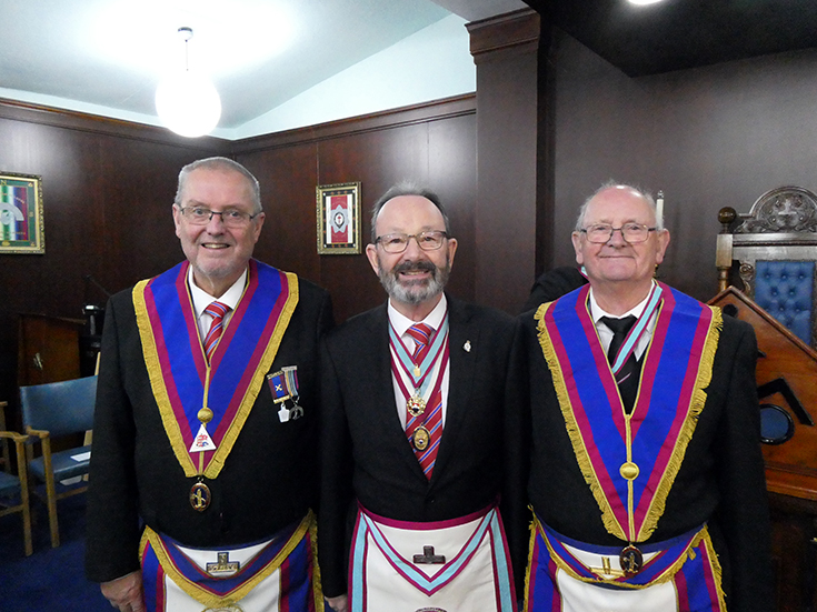 A ballot was taken for the candidate W. Bro Peter Dunn (the Masonic Hall Secretary), which proved successful, and the officers of the Lodge worked through an excellent ceremony of advancement. The DC, W. Bro. Dennis Smith acted as SD and expertly guided the candidate through the ceremony accompanied by the JD, Bro Gavin Egan. |
