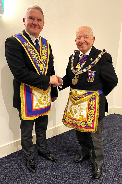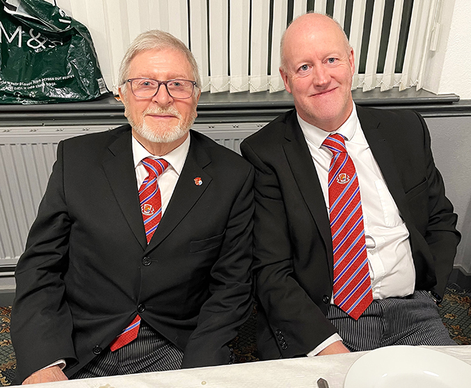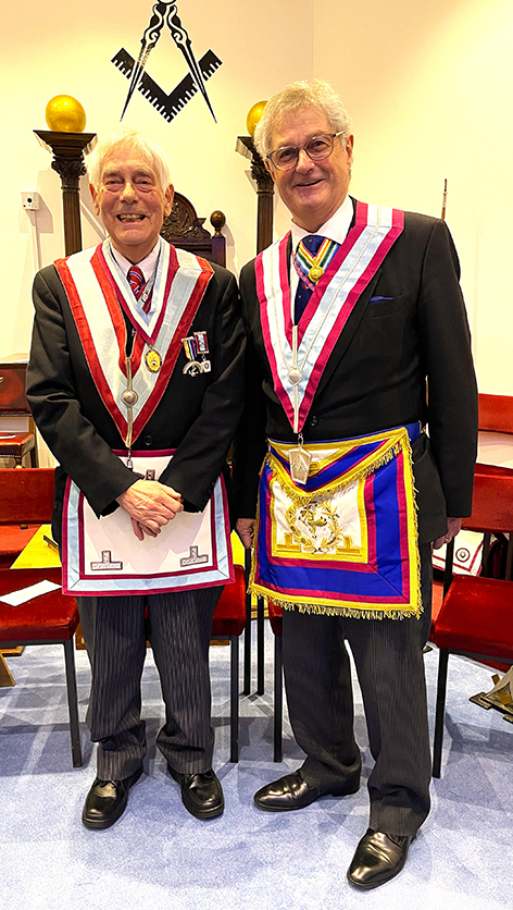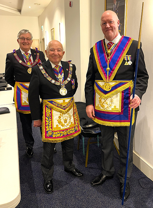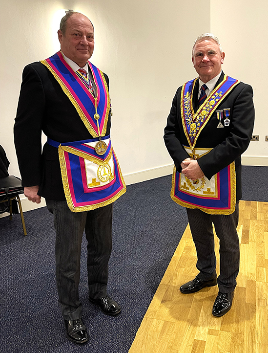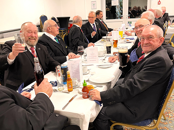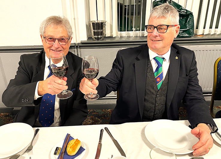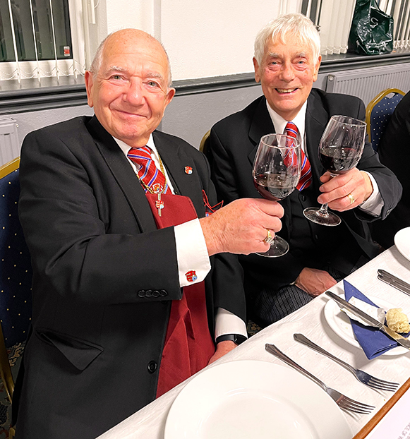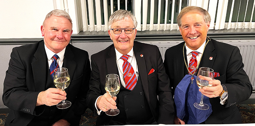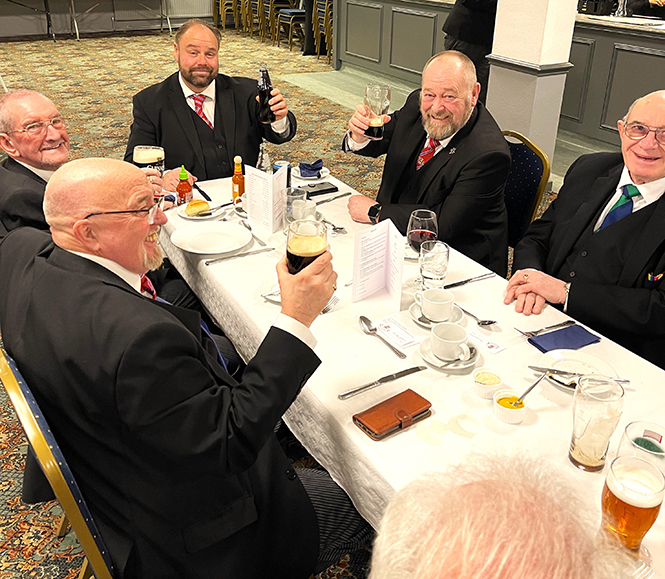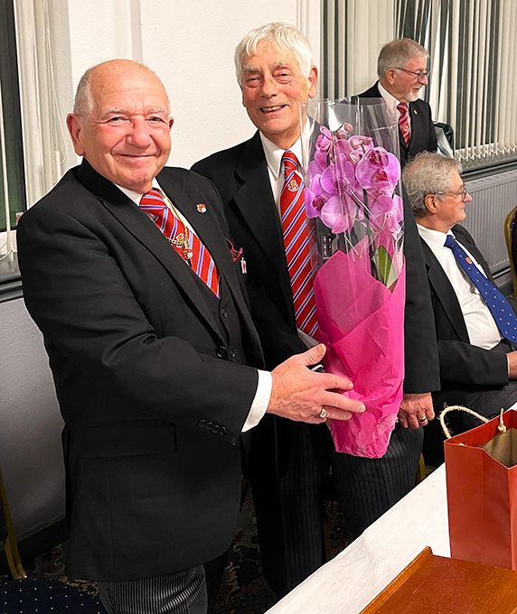After taking up the allotted seats for the Festive Board an excellent meal was served up by the very friendly and attentive Hall Staff, the usual Toasts and responses were all well received including the Order Of Merit which was presented to Mike Tonge for his good works in the Royal Ark Mariner Degree, a lovely bouquet was presented to Keith for his wife June and all too soon it was time to leave to all points of the Province, everyone giving the genuine handshakes of Mark Masons and saying their goodbyes. |