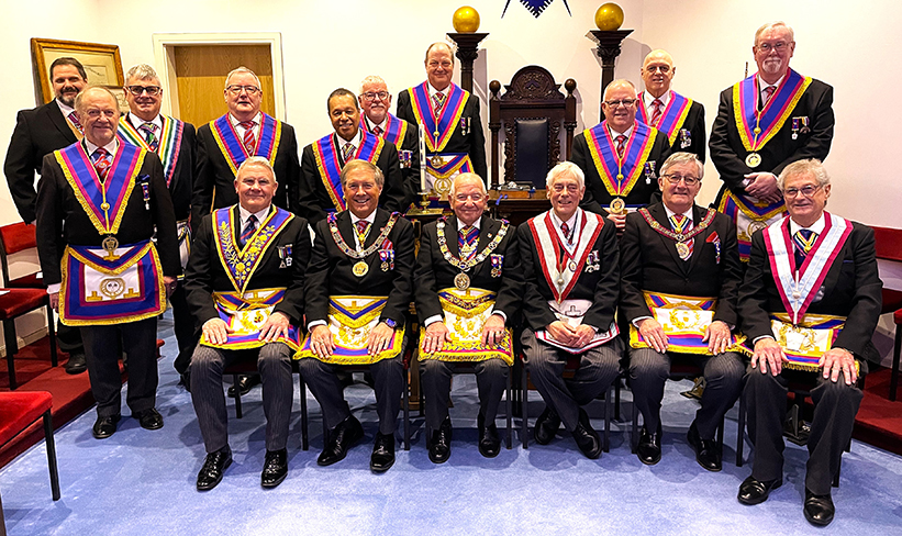 The time had come for the PGM to retire accompanied by the Acting Prov and Grand Officers, at its closing everyone made their way back into the Temple for the usual pictures to be taken to record the meeting, before crossing into the other building (Venue) for some liquid refreshment. | |