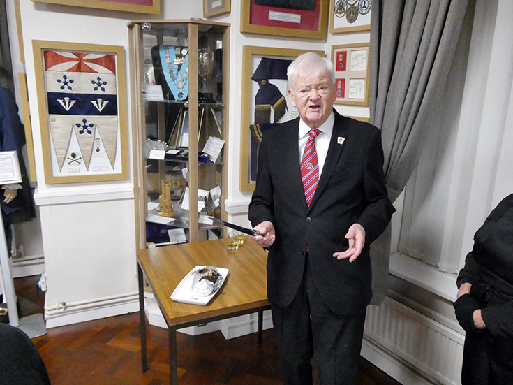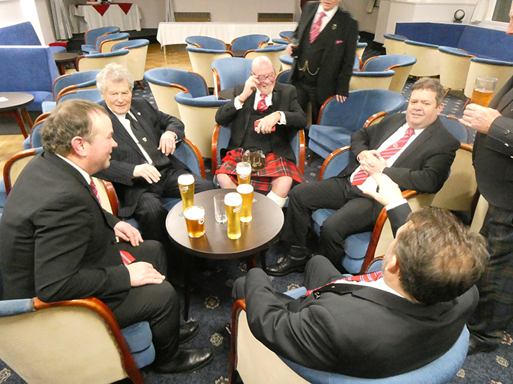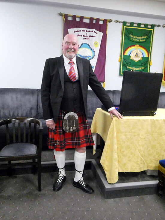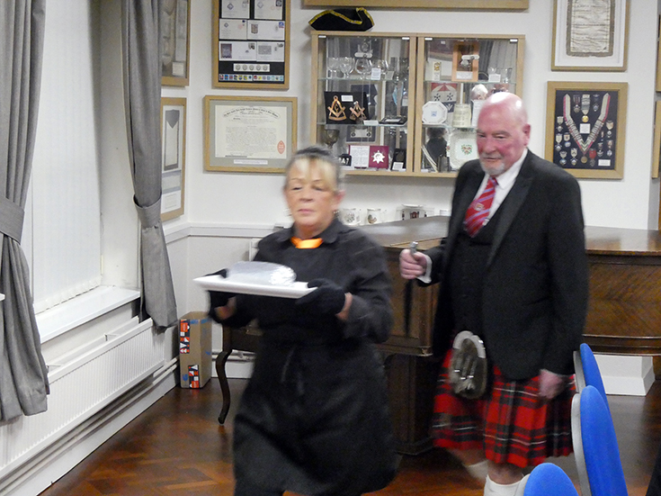 As it was Burns night, a number of Brethren attended and were resplendent in tartan attire. | |