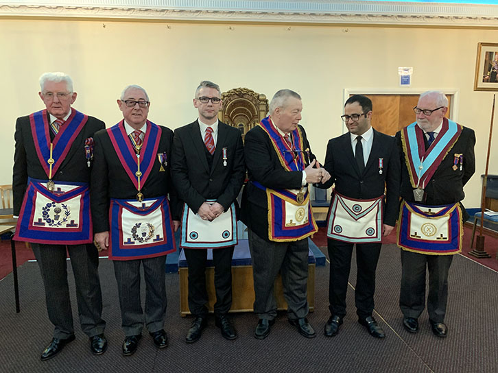 The W.M. congratulates the candidate, Bro. Pejman, accompanied by other Officers |