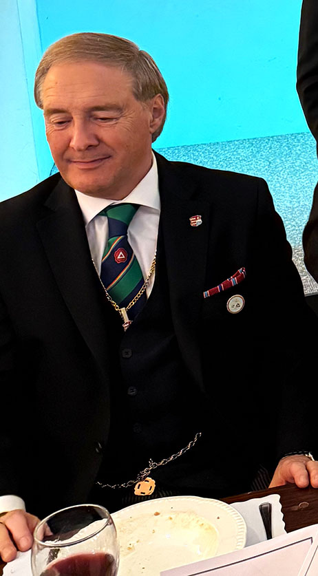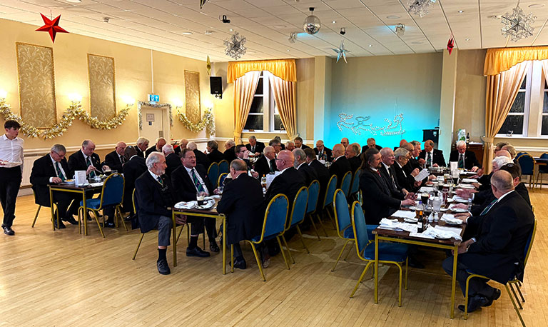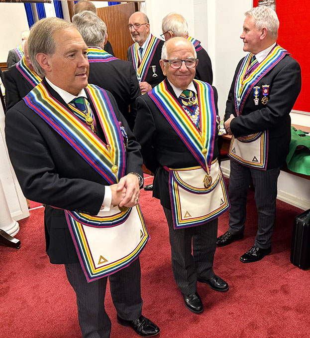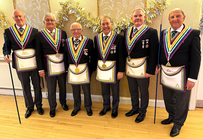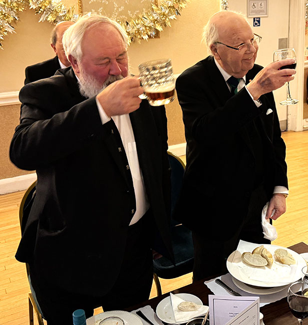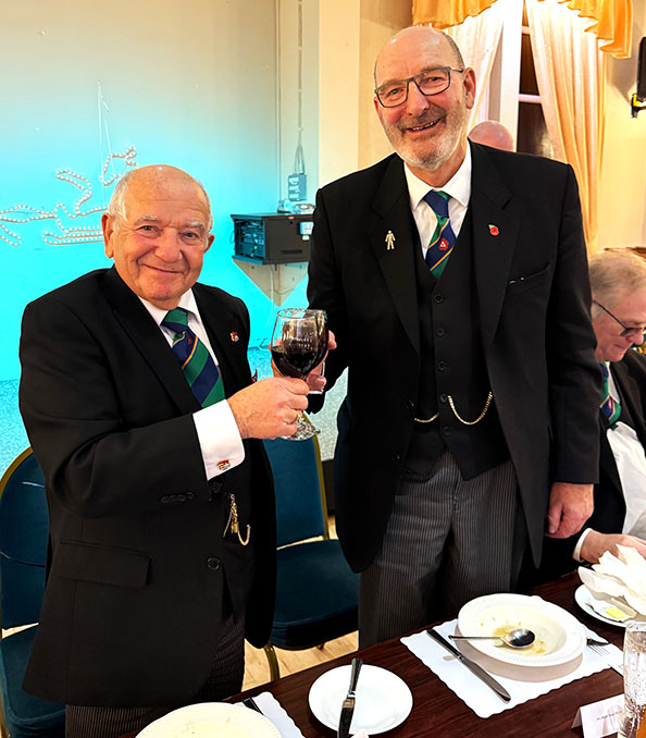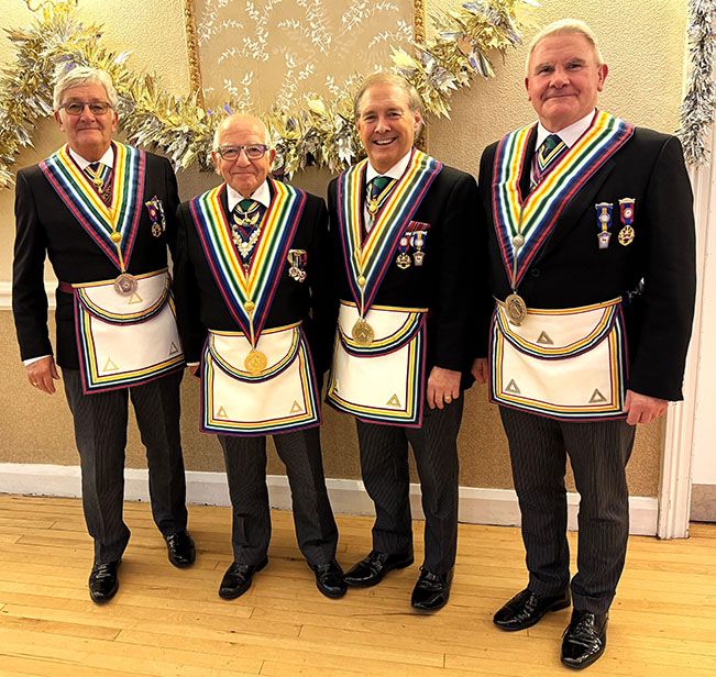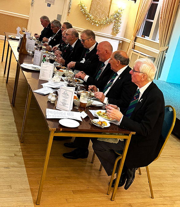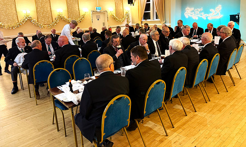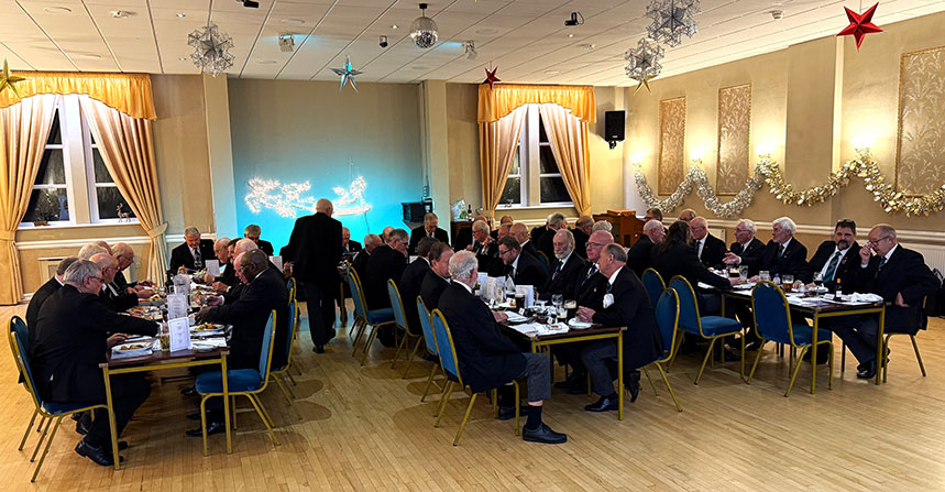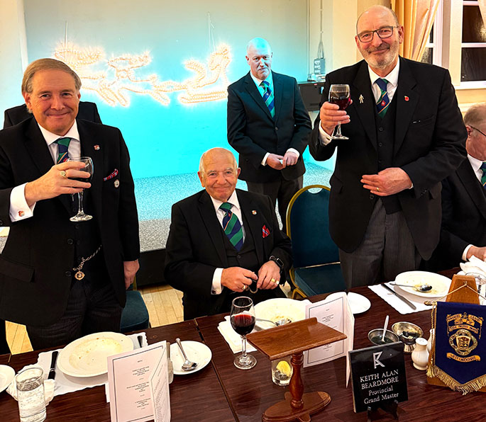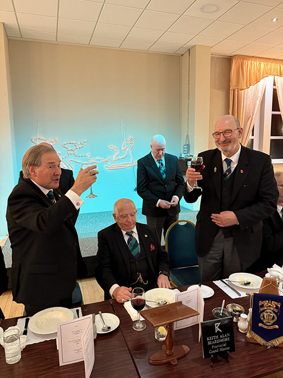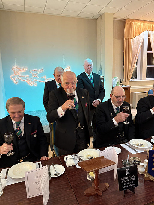 On closing everybody made their way back into the Temple for the usual photographs to record the occasion, then it was off to the dining room to get their glasses charged before taking up their allotted seats for the Festive Board. A First-Class meal was served up by the very friendly and efficient Hall Staff, a real credit all concerned. I was sat with some very pleasant Brethren and together we had some great conversation, and when that happens the time just flies by, before I knew it, we began the Toasts and Responses. | |