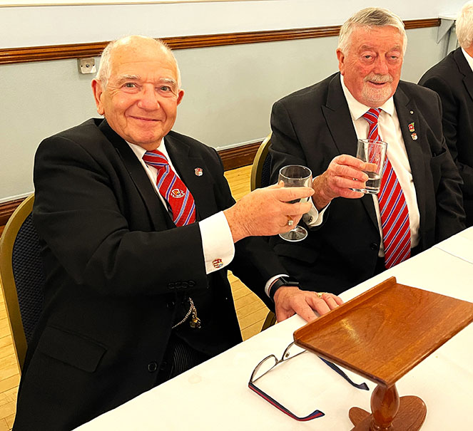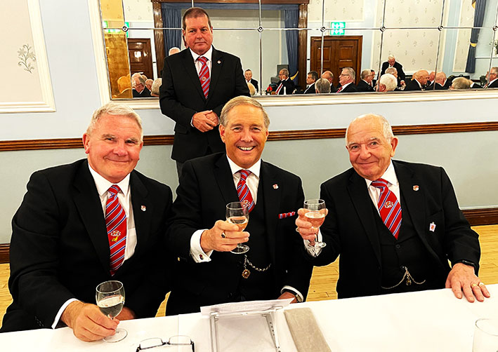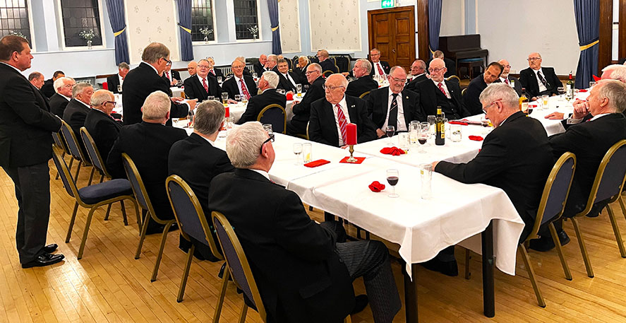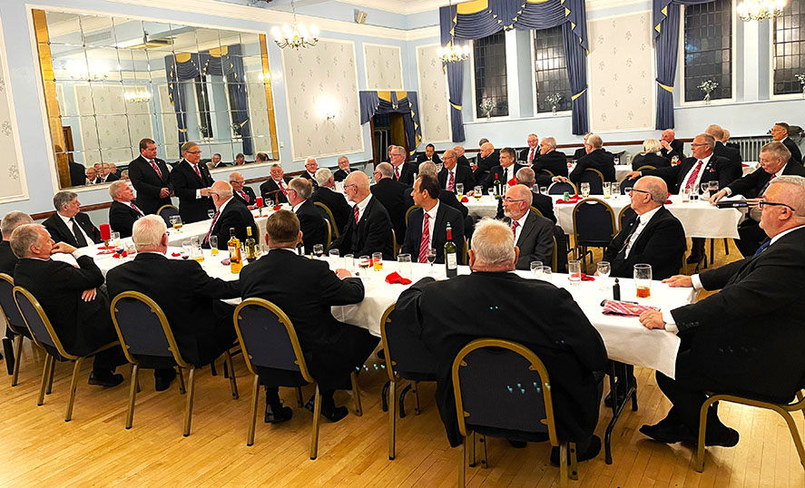 On closing the meeting everyone returned for the usual photographs to be taken to record the special evening, then it was off to the dining room to charge glasses and have a good chat before taking their allotted seats for the Festive Board. An excellent meal was served up by the very pleasant and efficient hall staff, Pate with some lovely toasted bread, chunky roast beef and plenty of vegetables finished off with fruit salad and cream, I noticed that all the plates were empty after each course which can only be a good sign, well done to the Chef and all the staff. | |