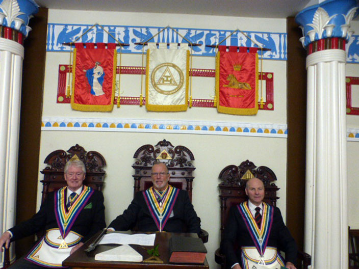 The Commander performed the ceremony and was assisted by his Senior Warden Bro John Barnes and acting Junior Warden, WBro Steve Roberts, (one of the visitors who had been persuaded to stay on). Another visitor, WBro Derek Gaskell acted as the Senior Deacon and also explained the Signs and Working Tools to Bro Roy Cowley. With Bro Roy Cowley safely on board the Ark it was time to move on to the Installation. | |