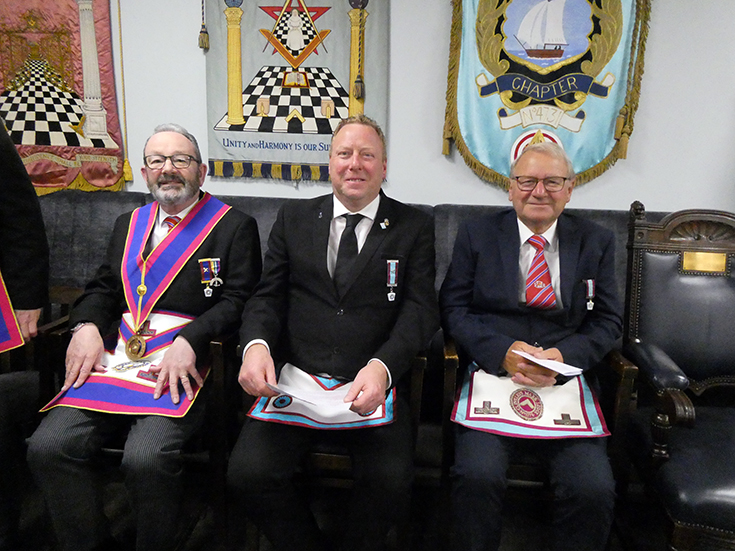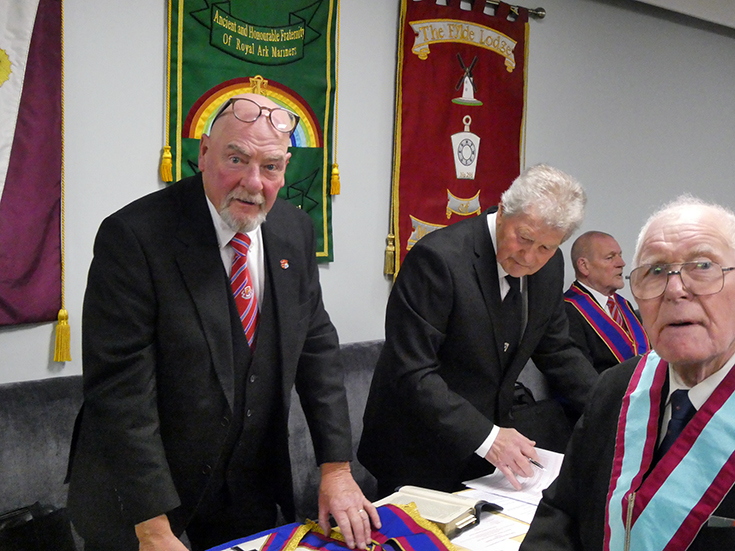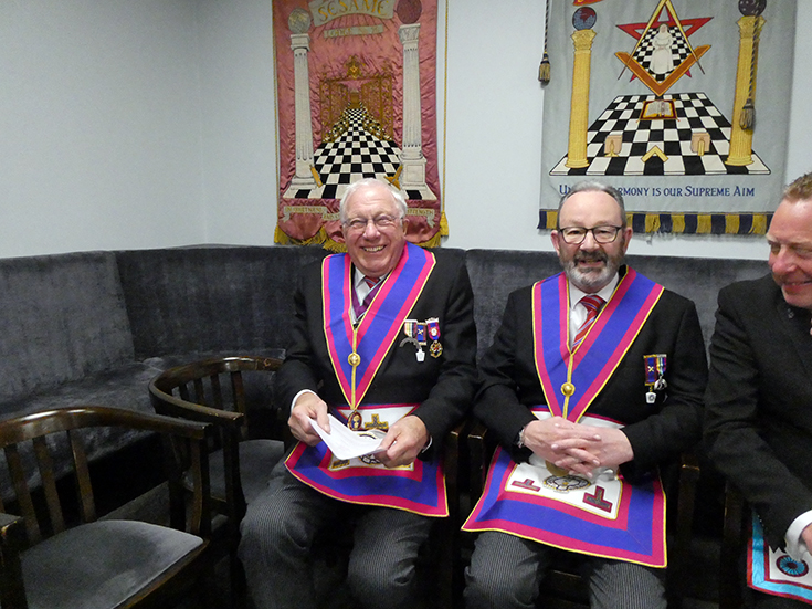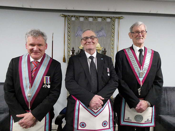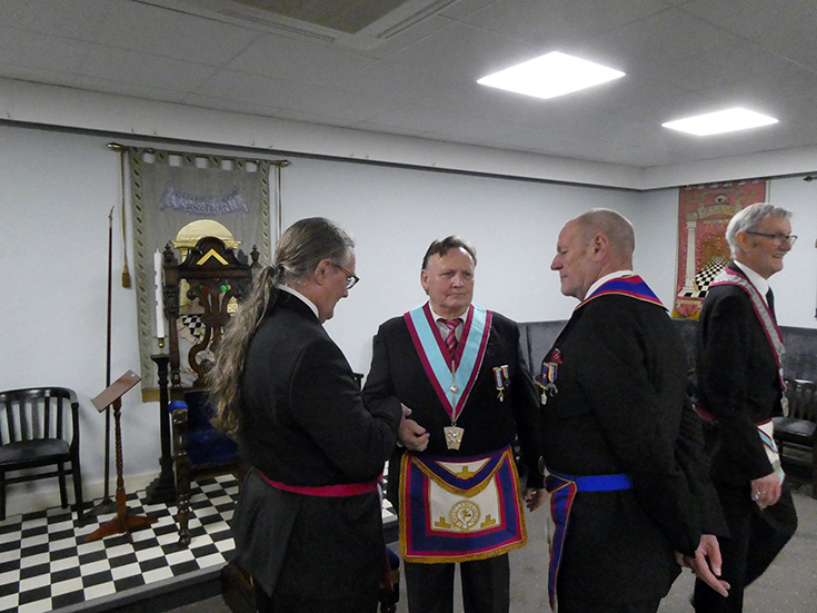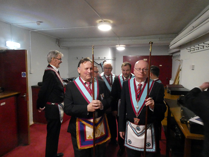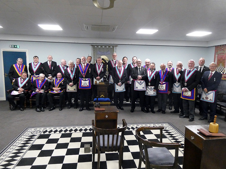 Twenty-five Brethren (nineteen members & six visitors; WBro. David Kenworthy, WBro. Paul Smedley, WBro. Russ Forsyth, Bro. Andrew Greenlees (recently advanced) and WBro. Tony Cross plus the candidate for the evening were in attendance. | |