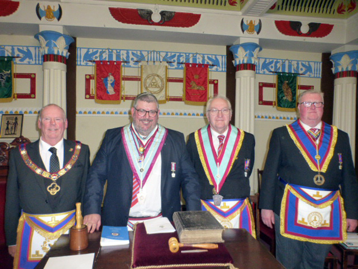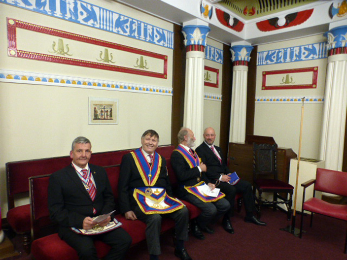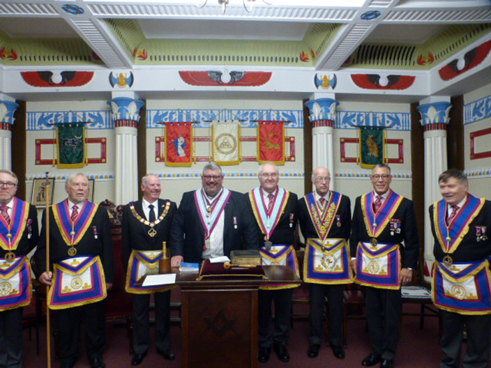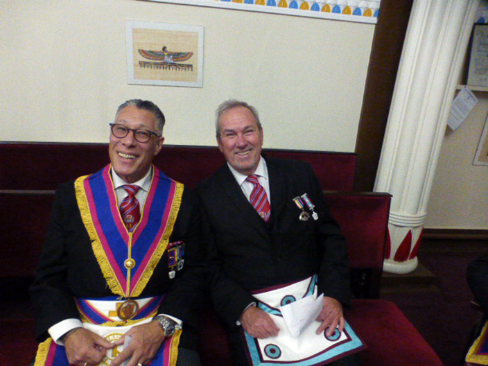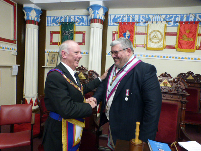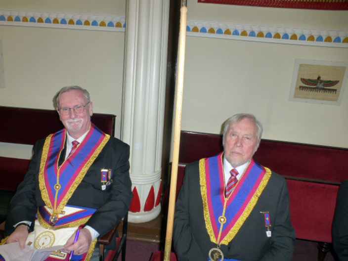 | The ceremony was carried out by WBro Adrian Williams and WBro Chris Walls and this made it an enjoyable installation. WBro Chris presented the Working Tools and then went on to do the Address to the Master and the Address to the Wardens and as with everything Chris does it was all first class. WBro Derek Gaskell presented the Keystone Jewel to the Master. WBro Jorge Perez; Prov. GJW gave the address to the Overseers. | |