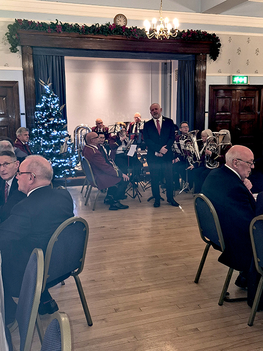 | After dining, out come the carol books, firing glasses, port and the Marshside Brass Band. | |