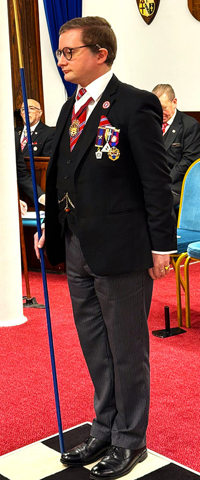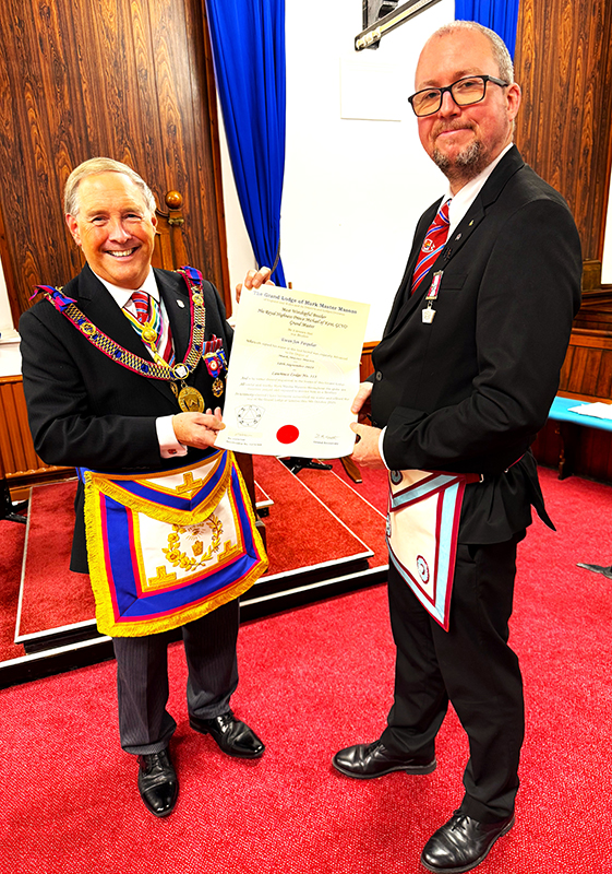 | Before closing a Grand Lodge Certificate was presented and explained by Dep. PGM V.W. Bro. Giles Berkley to Ewan John Farquar. | |