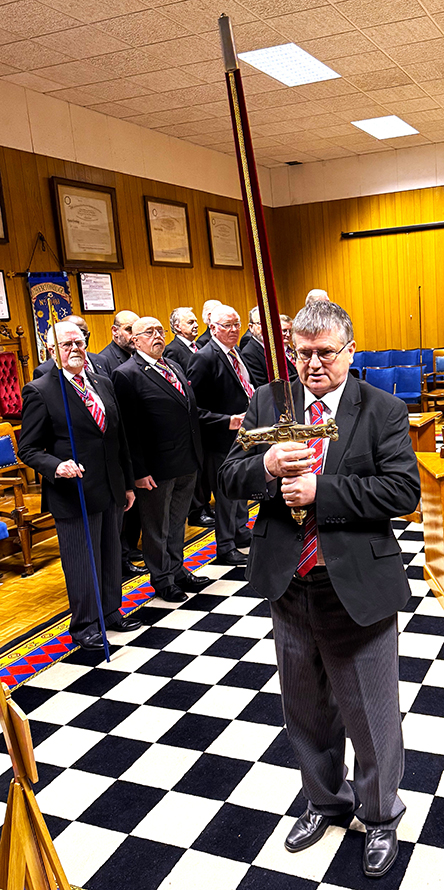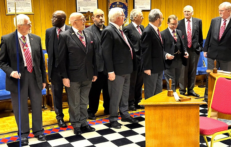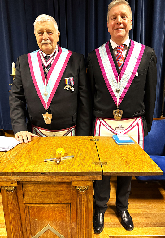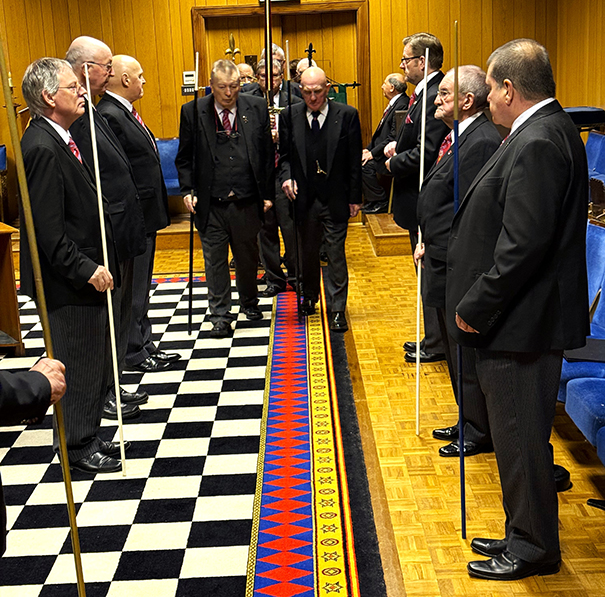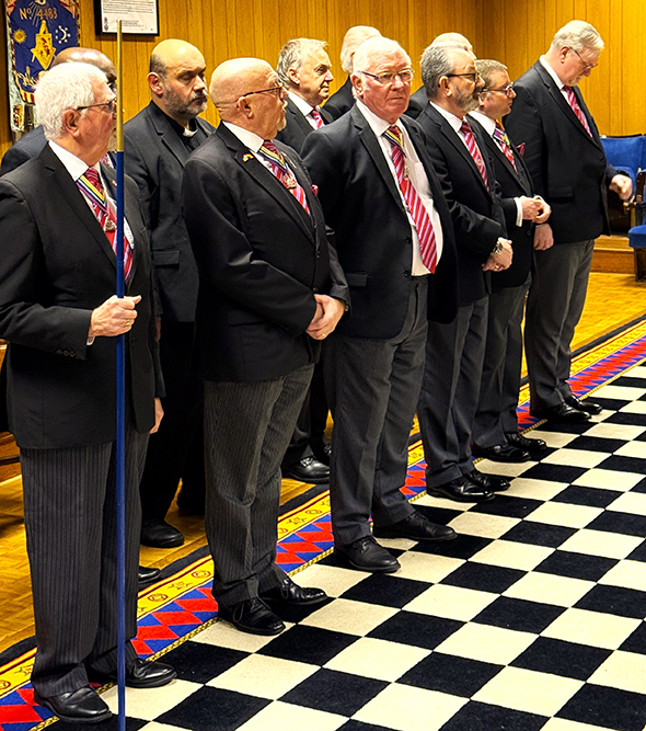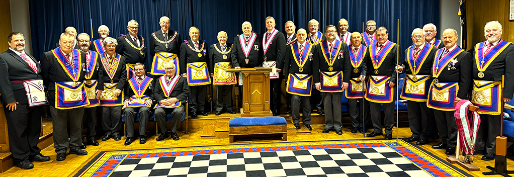 Well, it was pitch dark, freezing, misty and raining but once I got inside climbed the stairs, I was met by lots of smiling faces and welcoming handshakes. The meeting commenced on time at 6pm and following some items of housekeeping a knock on the door the Inner Guard announced the arrival of our GM the RW Bro. Keith Alan Beardmore G.M.R.A.C. he entered Lodge accompanied by Acting Grand and Provincial Grand Officers. The WM W.Bro. Craig Sutton welcomed Keith to the proceedings of behalf of everyone present and offered him the Gavel which he said on this occasion he would accept so as to introduce members of the Team, but he would be careful not to hold to it for too long as he knew Craig was really looking forward to Installing Bro. William Robb into the Chair of Adoniram. |