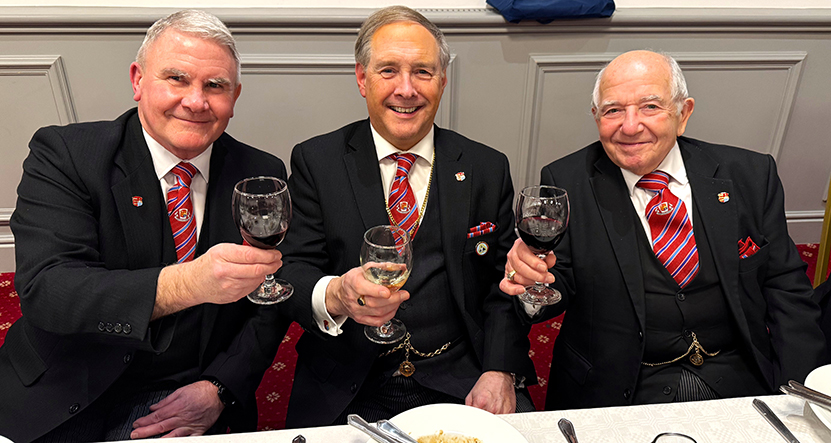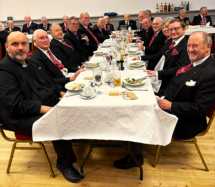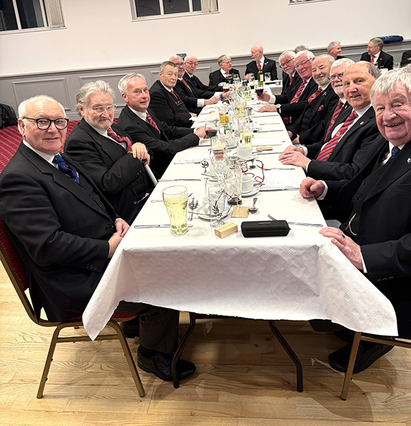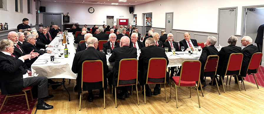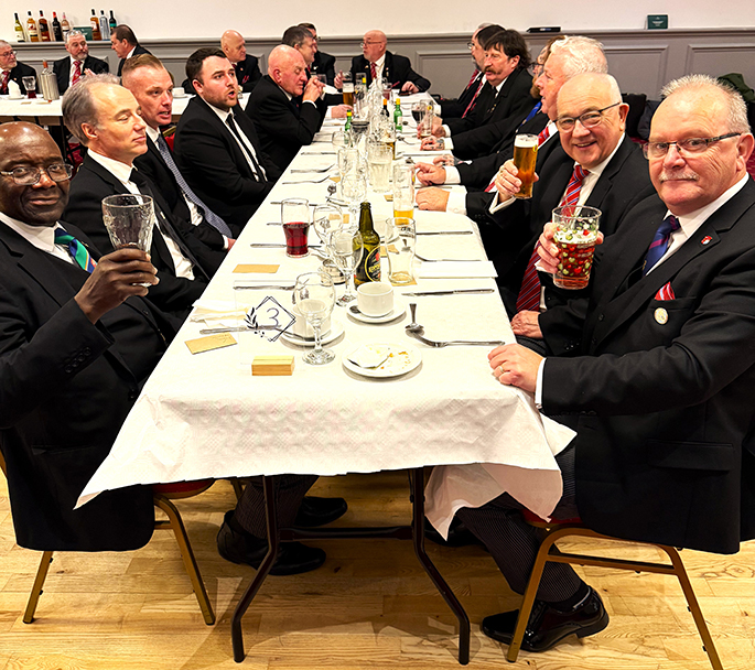 Everyone made their way back to the Lodge room to mark the occasion with the usual photographs to be taken before going downstairs, charging their glasses and taking their allotted seats for the Festive Board. An excellent meal was served by the very efficient and pleasant Hall staff. The usual Toasts and responses followed, including a large raffle for the Charities, then sadly the evening was coming to an end with the genuine handshakes and goodbyes shared by Mark Masons, overcoats on before stepping out into the chilled night air. | |