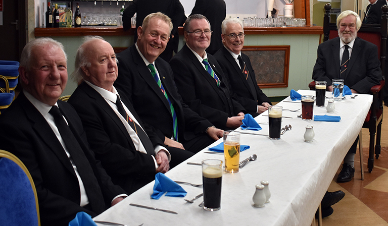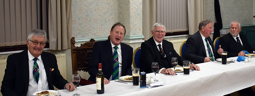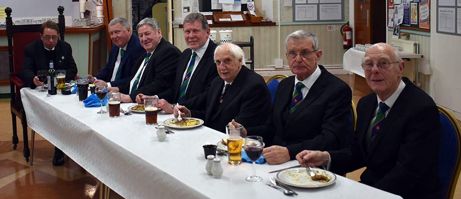 Following the formalities of the lodge room it was on to the dining room. Worshipful Commander Paul was feeling rather nostalgic for his early years and had selected a school dinner menu of cottage pie followed by jam roly-poly. It was very well received. | |