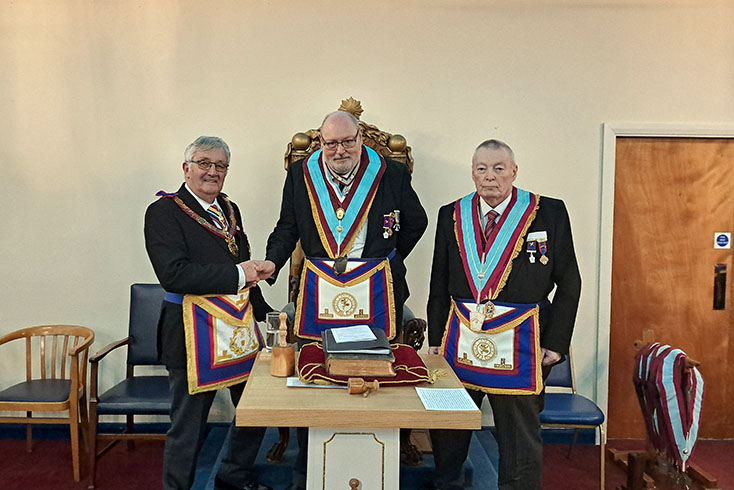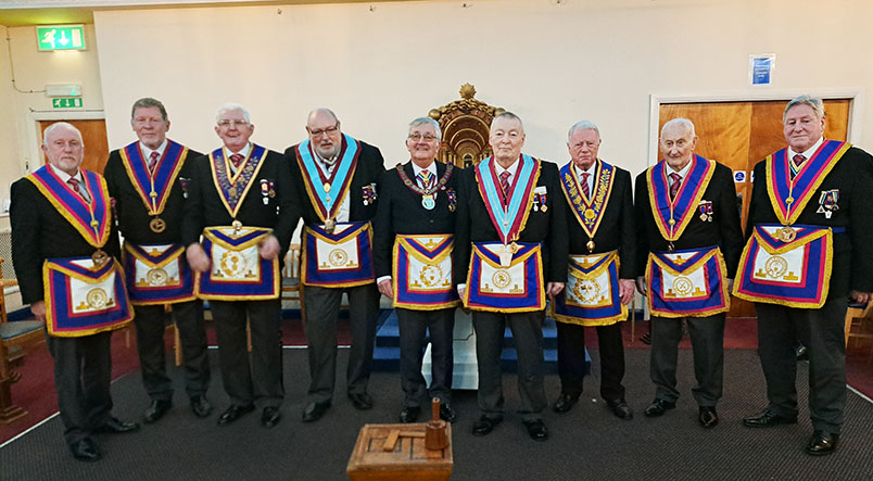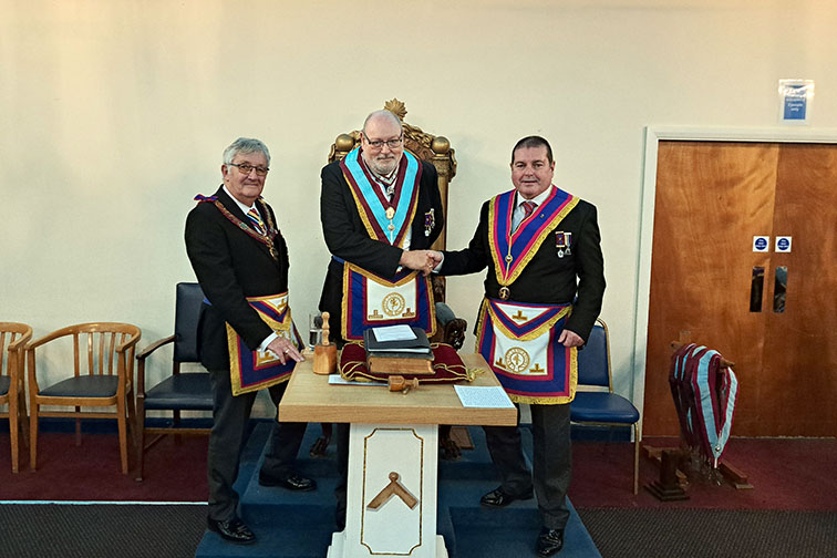 | W.Bro. Mark Holloway was then regularly installed into the chair of Adoniram, with the officers closely following. Addresses where given by W.Bro’s Roy Hedges, Bob Povall, Mike Melling, and last but not least, Geoff. |