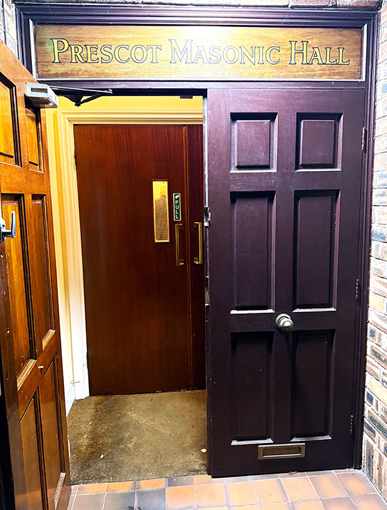 | Never mind we have the meeting to look forward to, simple directions from M62 take Junction 6 on to the A57, a further few miles and the sign said Welcome to Prescot, well this is where the fun began, up and down the Main Street, looking this way and that way, no obvious Masonic Hall. Eventually dumped the car and started walking, asked a local walking his dog, he said ere lads it’s just round corner down a ginnel, and so it was. | |