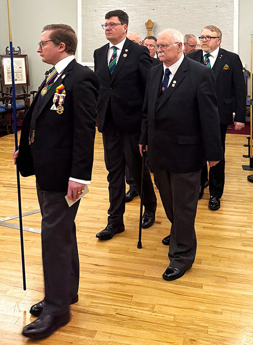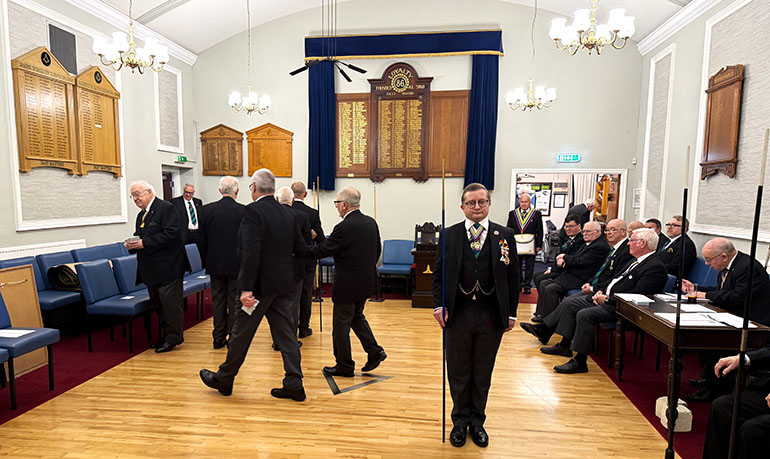 | The meeting commenced on time at 6 pm, following some housekeeping items it was time for the Team to enter lead in of course by the PGM, he was welcomed by the Worship Commander on behalf of all present and offered the Sceptre, he thanked the W.C. but said on this occasion he declined it saying there was much to do and was sure the members were eager to continue with the Ceremony. | |