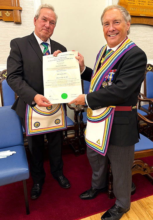 | Once the usual questions had been asked and answered, all below the rank of an Installed Worshipful Commander were asked to retire for a short period, the Installation of Bro. Thomas Grimes continued at a pace and in as fine a style as you will see by W. Bro. Jorge Perez, who also gave the address to the new W.C. The Working Tools were presented and explained by Bro. Raymond Parr who on the night was presented with his Grand Lodge Certificate by the V.W. Bro Giles Berkley DPGM. | |