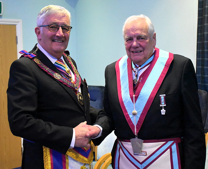Work commitments and other issues meant that several lodge members were unable to be present. However, this gave an opportunity for some visitors to play a part. Alan Gregory and Ken Needham of Morecambe Mark acted as Junior Warden and Junior Overseer respectively whilst Peter Quirk of Jubilee Mark stood in as Senior Overseer. Their involvement seemed to add to the friendliness surrounding the whole proceedings.