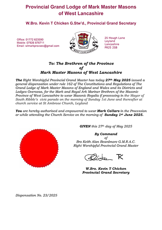 The new Mayor of South Ribble who is the Master Overseer of Preston Mark Lodge 143 would welcome support for civic parade on Sunday 1st June when West Lancashire Freemasons are invited to take part in the parade. The Provincial Grand Master has issued a dispensation for the wearing of collars. | |