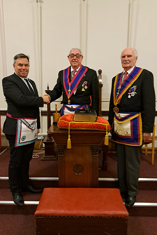 Bro Kernahan with Maurice Myers Evans, acting W.M, and Nornan Jones