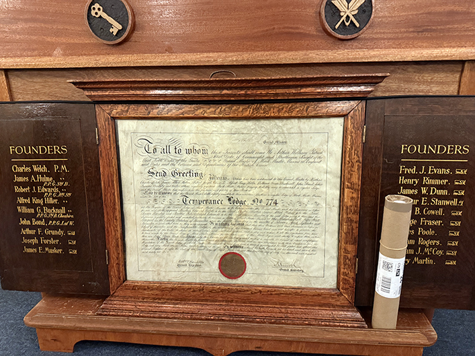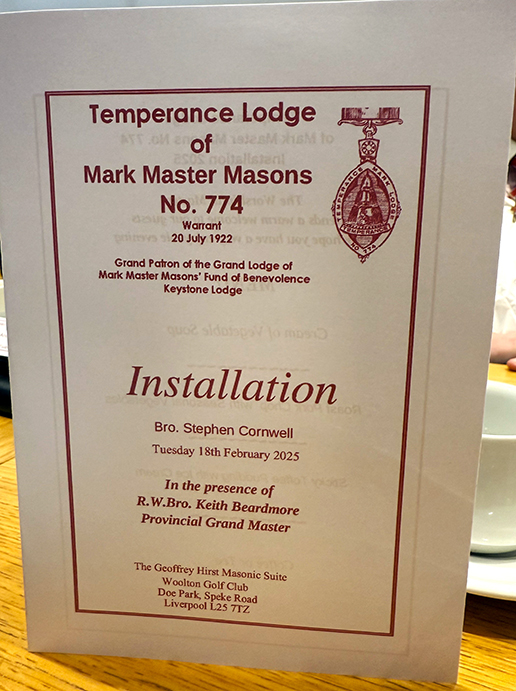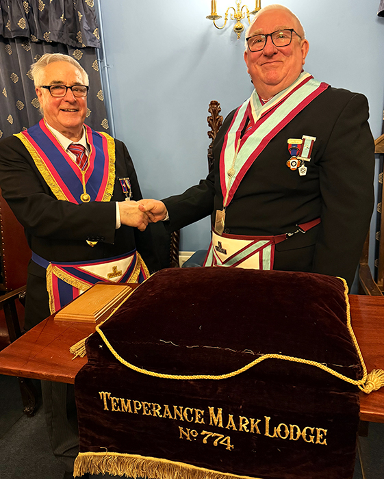 Keith then gave his personal congratulations to the new W.M. who in return was pleased to present him with a cheque for £200 made out the West Lancs Mark Charity Fund, which he said would be well received and put to good use. A Mark Grand Lodge Certificate was presented and explained by Asst PGM W. Bro. Mike Pinckard PGStwd to Bro. James Evans. Now the PGM along with Grand and Acting Provincial Grand officers retired and on closing everyone returned for the usual pictures to be taken to mark the occasion, especially as this could be the last time Temperance will meet here.