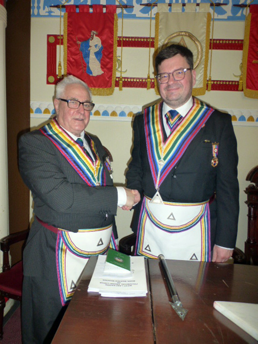 | When all the officers had been appointed, WBro Gaskell gave the address to the Commander. WBro Steve Walls then brought the congratulations of the Provincial Grand Master to WBro Graeme Edwards for once again taking the chair. WBro Walls also congratulated WBro Derek Gaskell on the ceremony. We wish West Lancs 65 R.A.M and WBro Graeme Edwards a very happy and successful year. | |