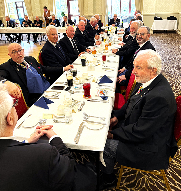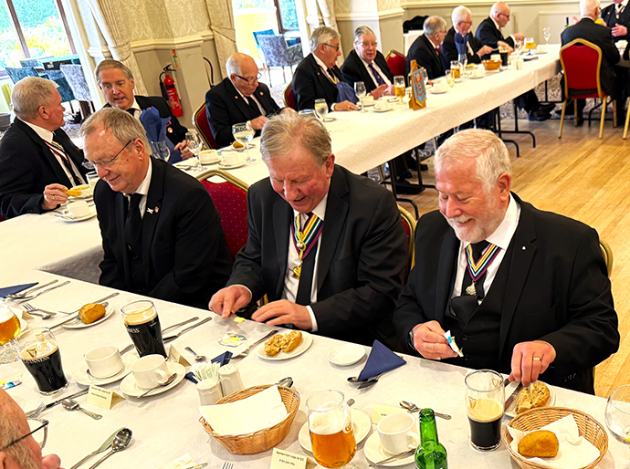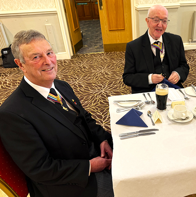 | Everyone present then made their way downstairs to the dining room, and once glasses were charged they all took up their allotted seats for the Festive Board. An excellent meal was served by the friendly and efficient hall staff, the usual Toasts and responses followed including the announcement of W.Bro. Chris Butterfield as SW elect and W.Bro. Paul Smedley as JW elect. | |