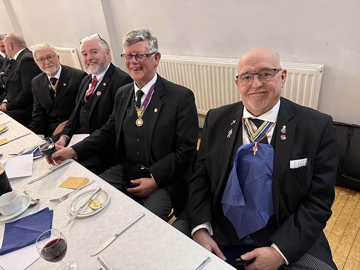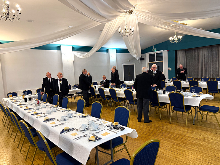 | On closing the Lodge, everyone returned for the usual pictures to be taken to mark the special occasion before making their way to the dining room, charging their glasses and taking up their allotted seats for the Festive Board. An excellent meal was served up by the very efficient and friendly hall staff, the usual Toasts and Responses followed including a new joke from our PGM, which on this occasion was funny!! | |