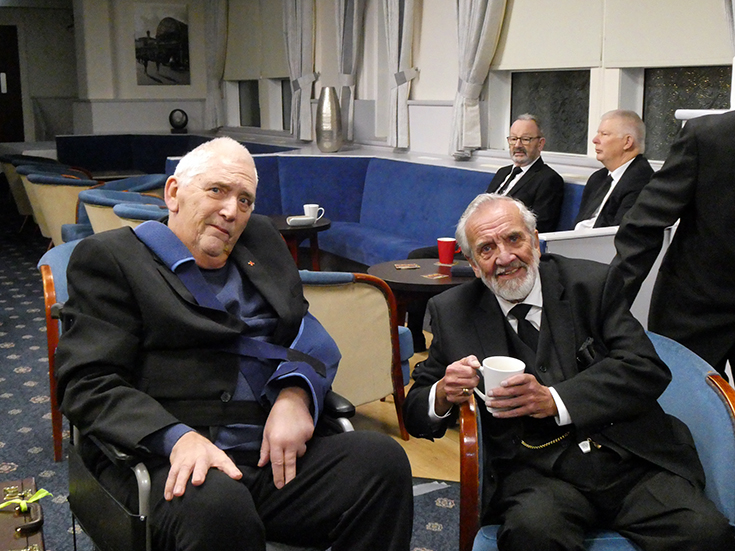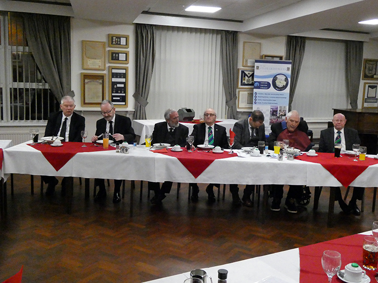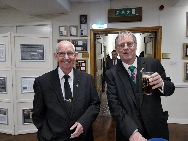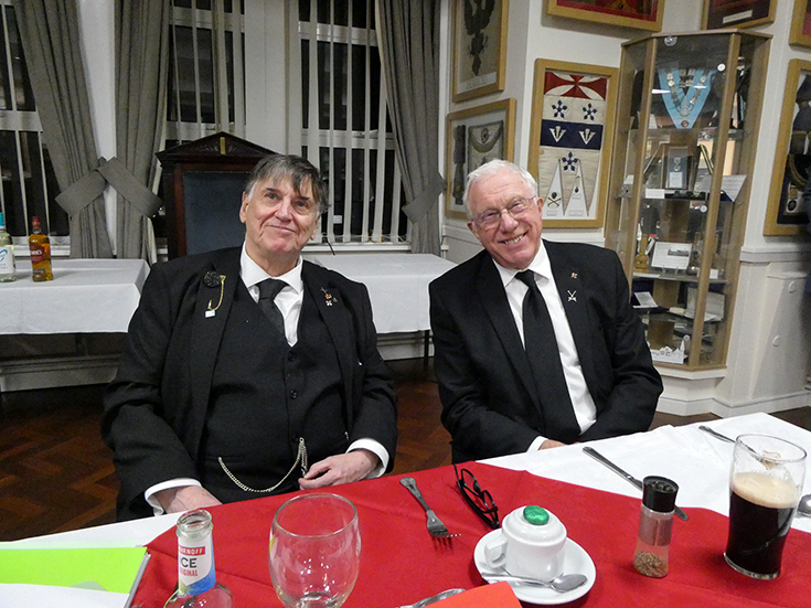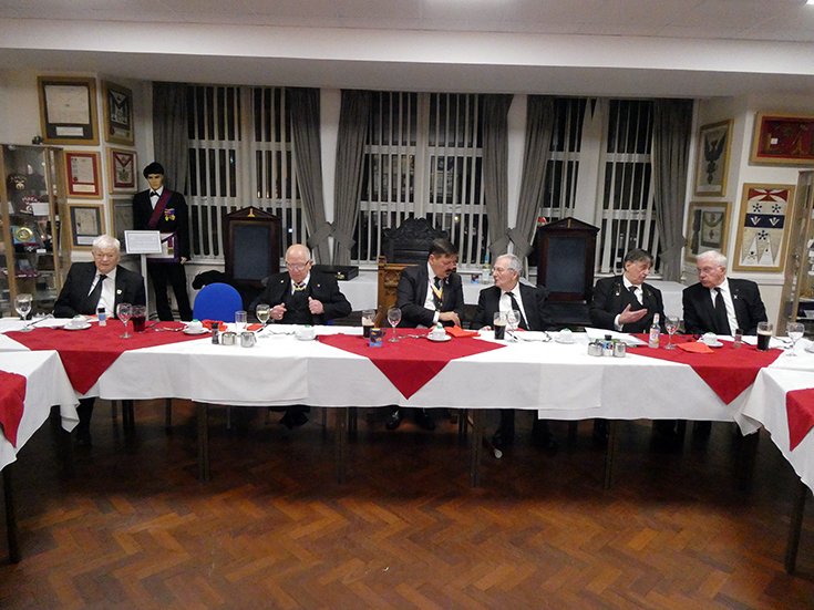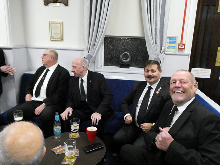 | The Lodge was closed and the Brethren rendezvoused in the East for crew photos and then to the bar for drinks and onto the festive board, which was lively with excellent food, banter and the usual Edmund Taylor good craic, which was enjoyed by all! | |
