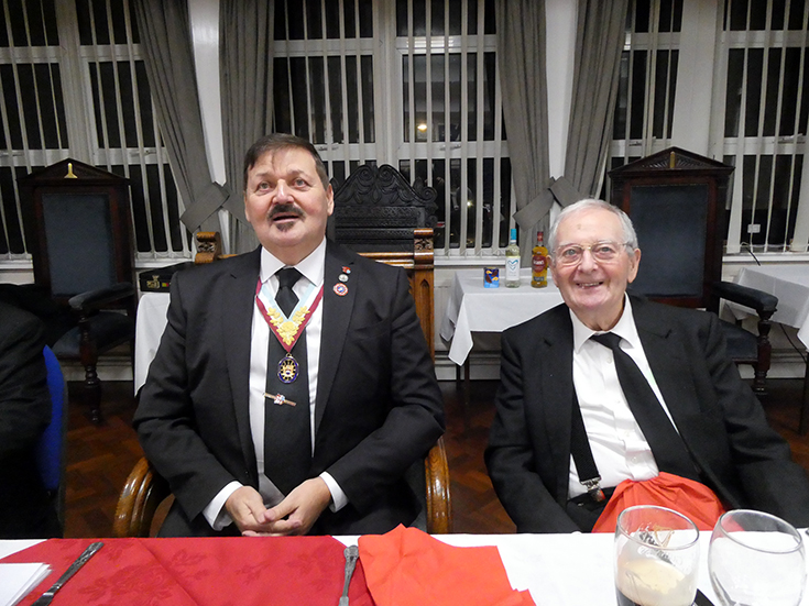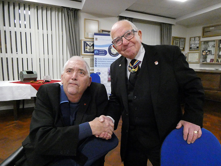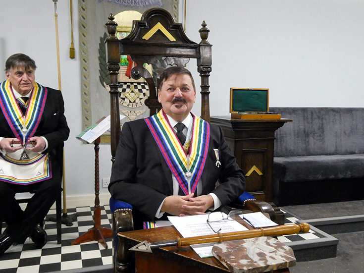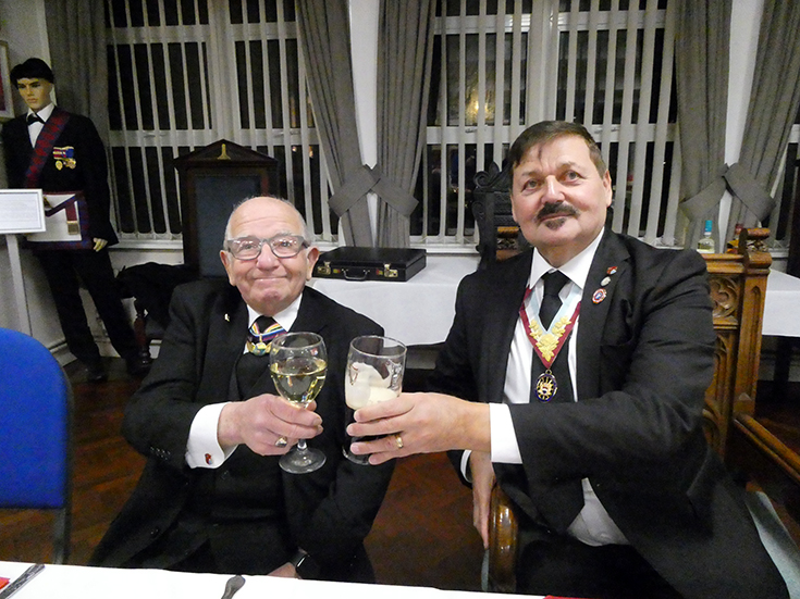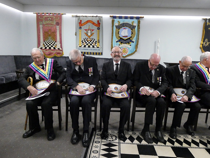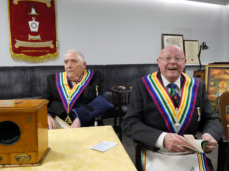 | The ballot proved in favour and then an excellent ceremony was carried out by the members of the Lodge, with Bro. Stevens guided around the Lodge floor by Bro. Dennis Askam and Bro. Chris Sage. | |